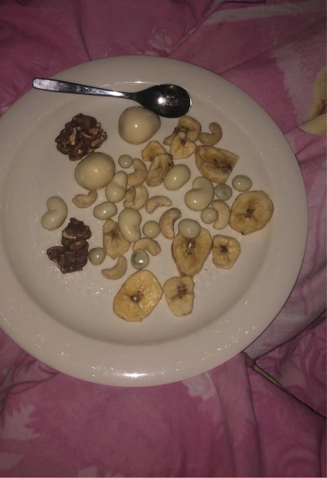 The smaller ones in the left are some yoghurt covered cashews and the two bigger ones are white chocolate covered, i’m sorry about the disgusting looking plate and spoon.