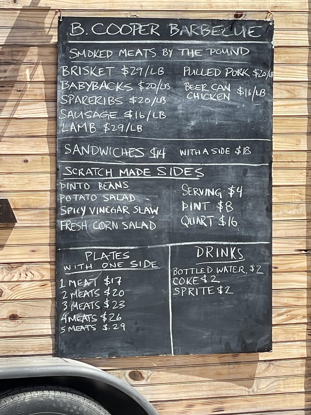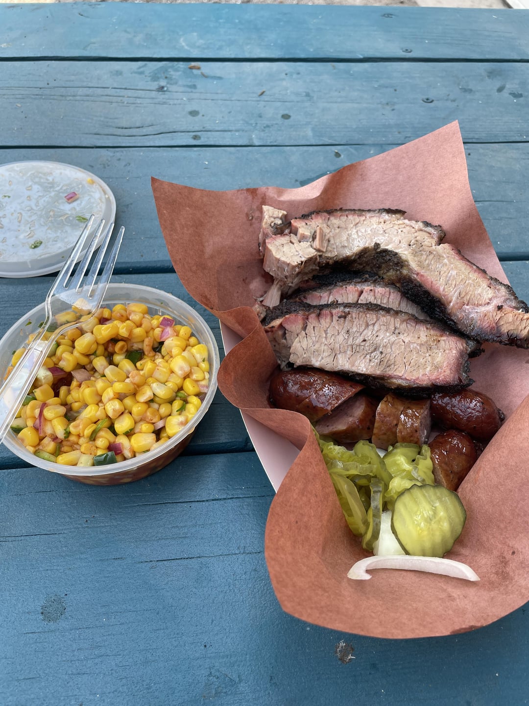 Went to check out B Cooper’s recent new location to Shady Ln at Wanderlust. I kind of liked the spot on Gunther St better felt more idk rustic and what Bbq is all about but hoping they do well at their new spot. They’re still kind of hidden and still very much under appreciated once again being the only one eating it on a Saturday when they open. The brisket was tremendous probably the best lean i’ve had yet, sausage was great, and it’s economically priced compared to many others. I had the 2 item combo with brisket, sausage, and corn salad. The corn salad was more like a corn salsa but it was very tasty and went well with the bbq. Highly recommend B Cooper.