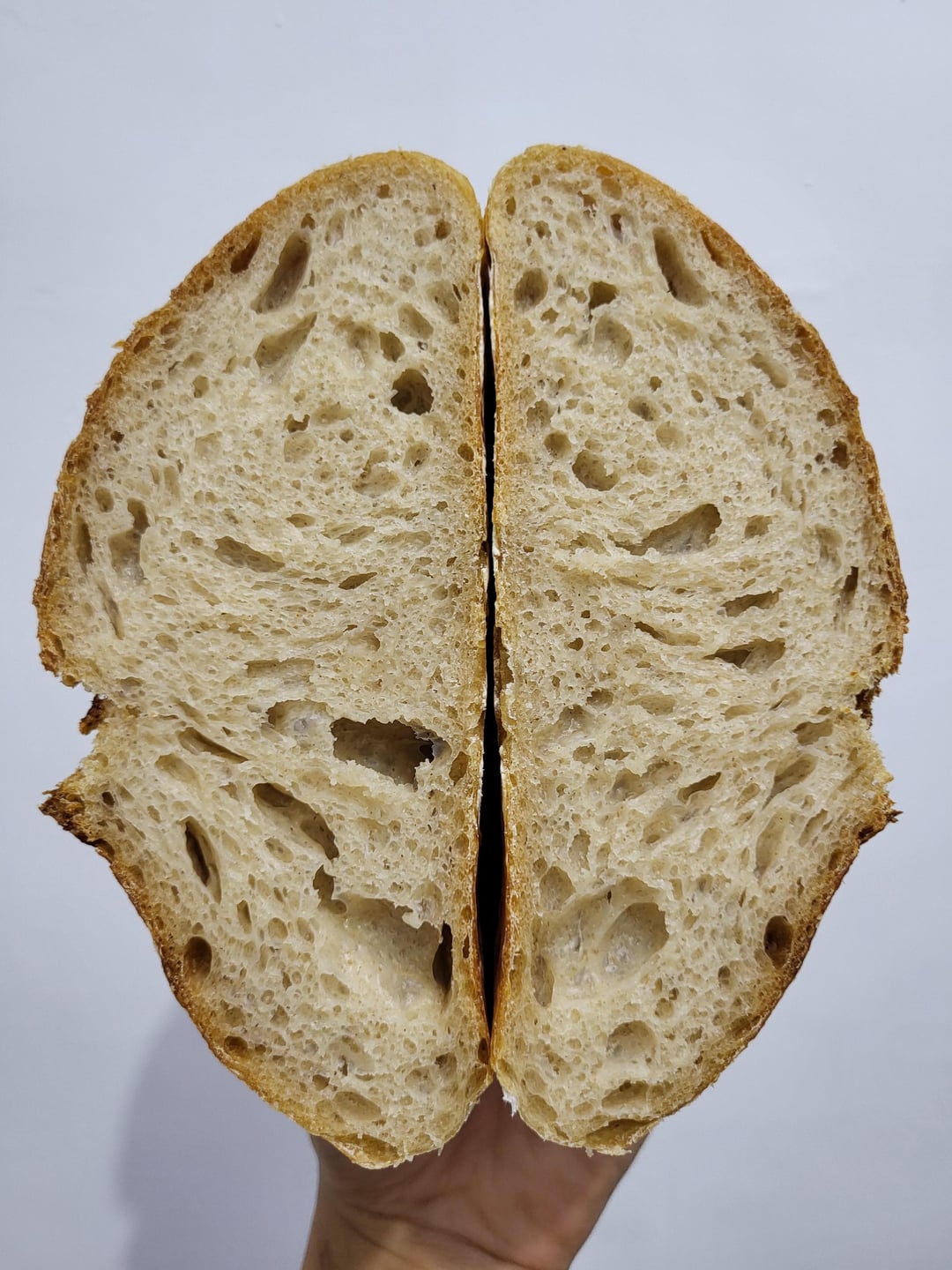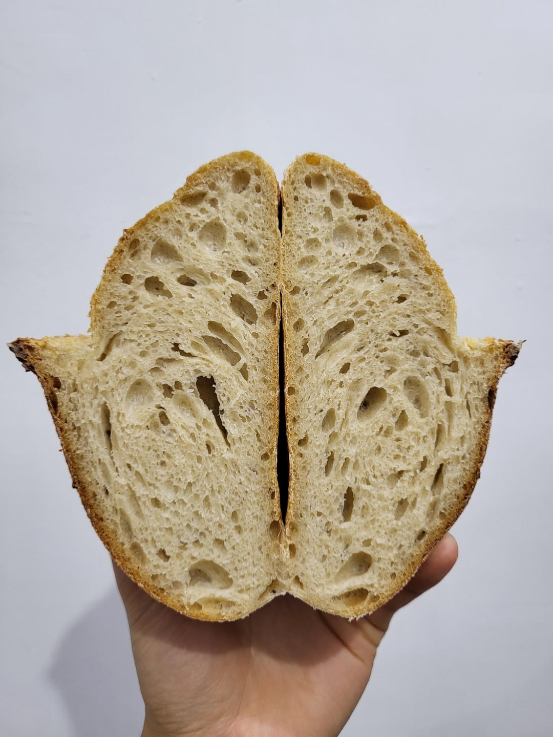 Autolyse 8 hrs -> mix all ingredients -> divide -> loaf 1 -> slap & fold until windowpane test is passed -> s&f 4 sets/30 min -> coil fold 4 set (bf 4.5 hr 40% rise) -> bench rest 30 min -> cold proof 15 hrs -> bake 230°C 20 mins with oven off & 45 min with oven on