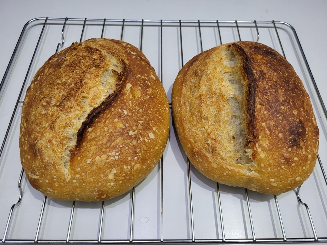 Autolyse 8 hrs -> mix all ingredients -> divide -> loaf 2 -> s&f 4 sets/30 min -> coil fold 4 set (bf 4.5 hr 40% rise) -> bench rest 30 min -> cold proof 15 hrs -> bake 230°C 20 mins with oven off & 45 min with oven on