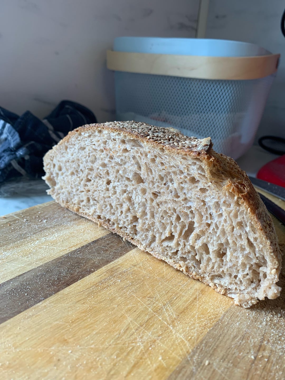 My 6th loaf. 50% whole wheat. Been having trouble with the rise so went from 75% to 80% hydration and a dry starter and she looks good! The knife I used for scoring is dull. I think I would’ve gotten a better ear otherwise. I think the shaping could’ve been better too.