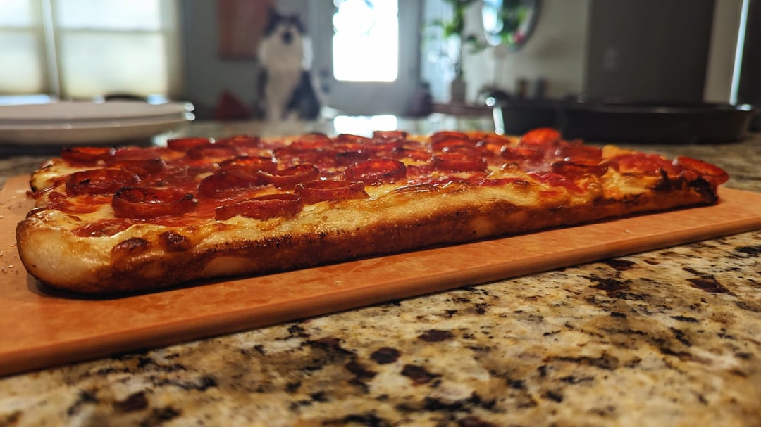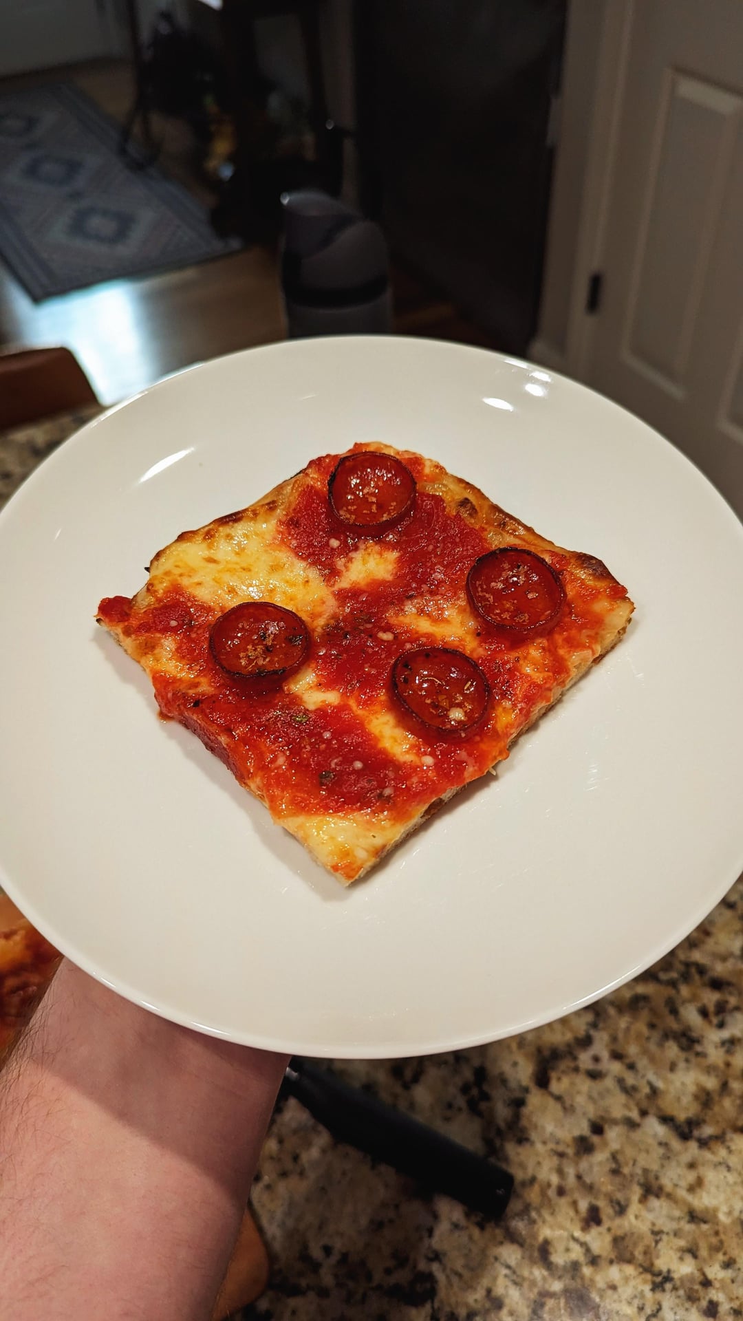 1. This is my standard New York style dough recipe, but I stretched it into a Lloyd Pan with some Olive oil. Sliced the cheese instead of shredding it, then used a ladle to put sauce on top before it went in the oven.
