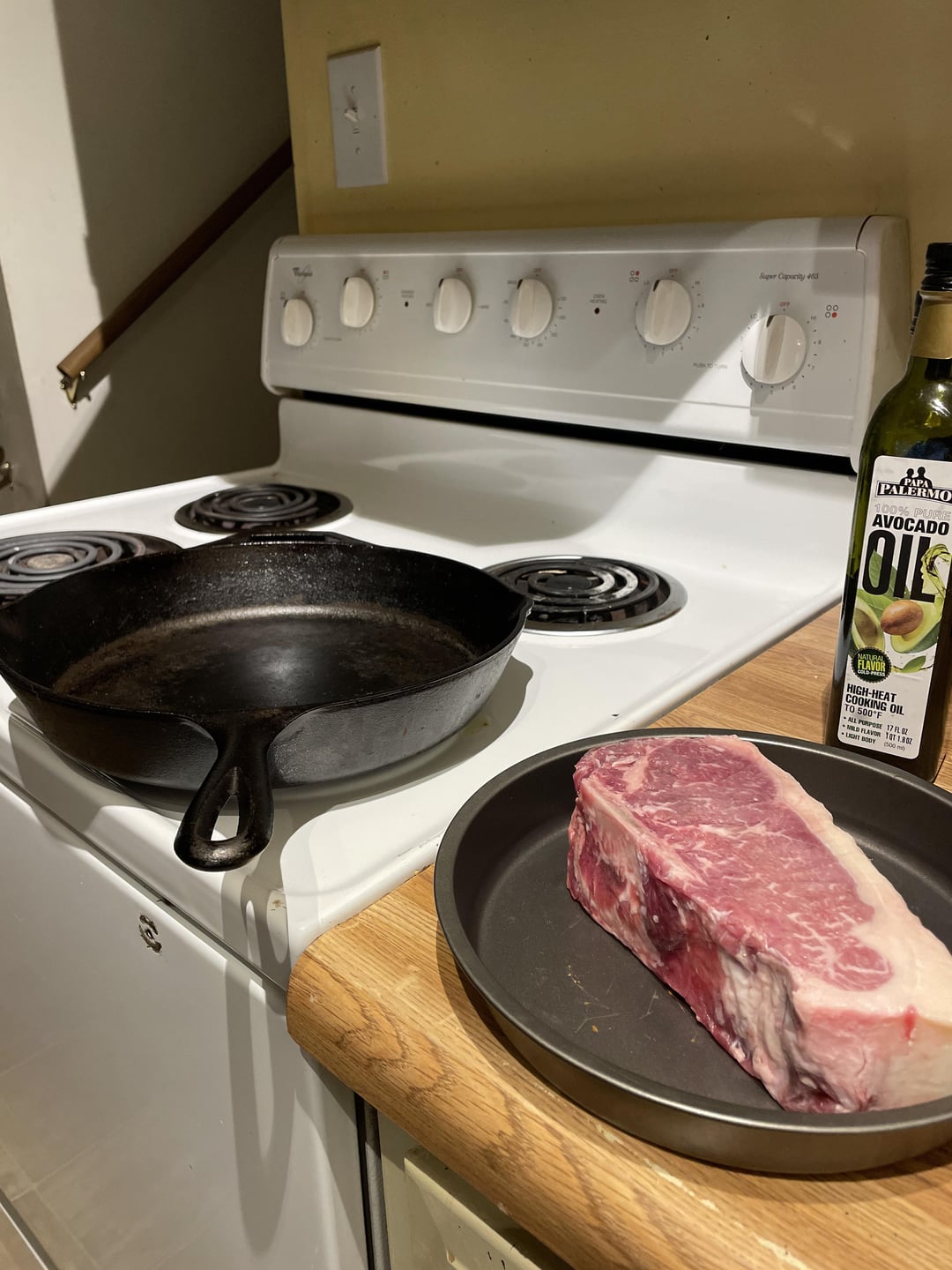 That’s a thick ass steak. Just get that skillet smoking hot !