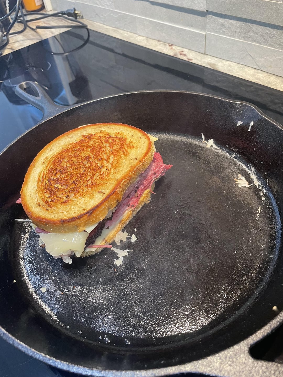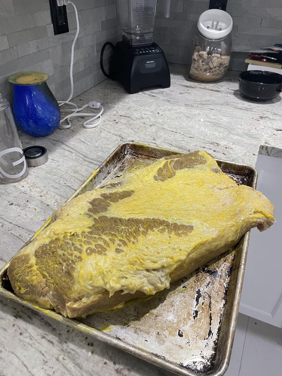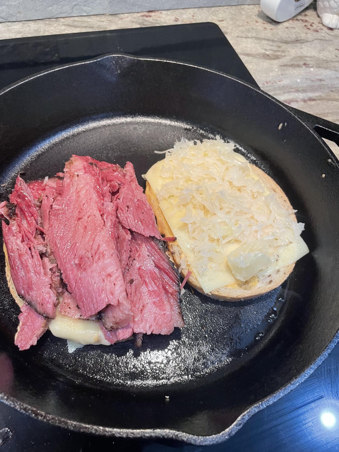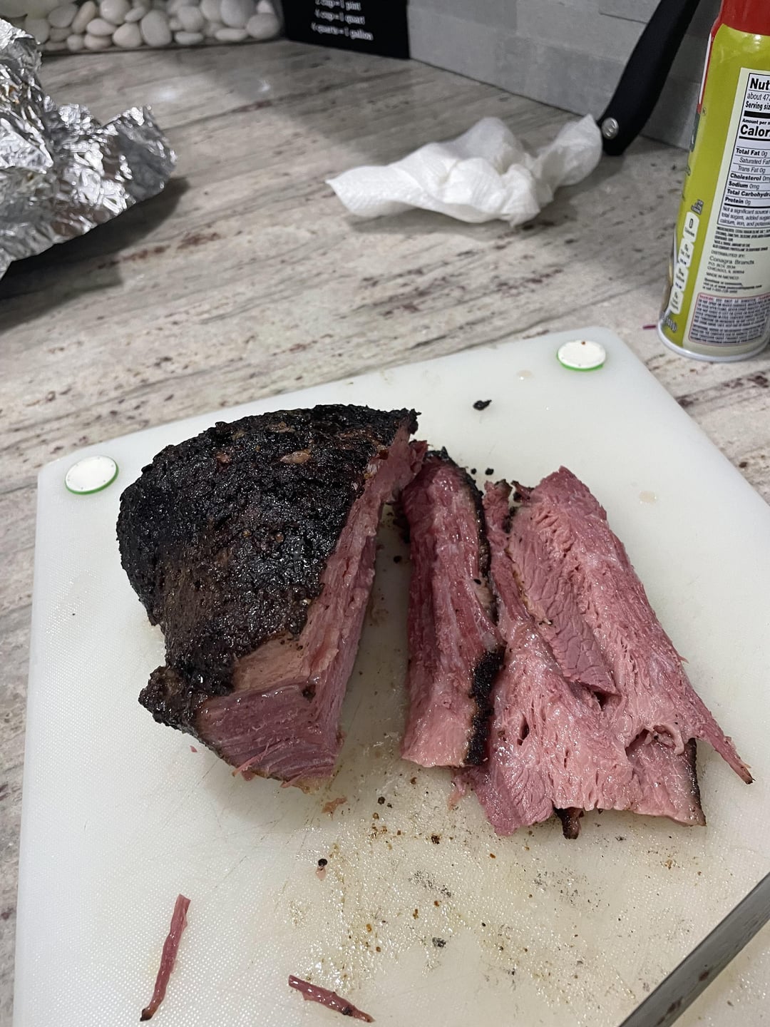 Brisket cured for 9 days in fridge, rinsed and soaked in water overnight. Coated in mustard and rubbed, put in the egg with some post oak chunks at 275 until it reached 199 internal in the point. About 6.5 hours and surprisingly no stall (maybe the high humidity?). Made Russian dressing from scratch, then grilled rye with swiss, sauerkraut, dressing and pastrami. It was amazingly good.