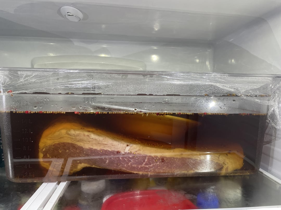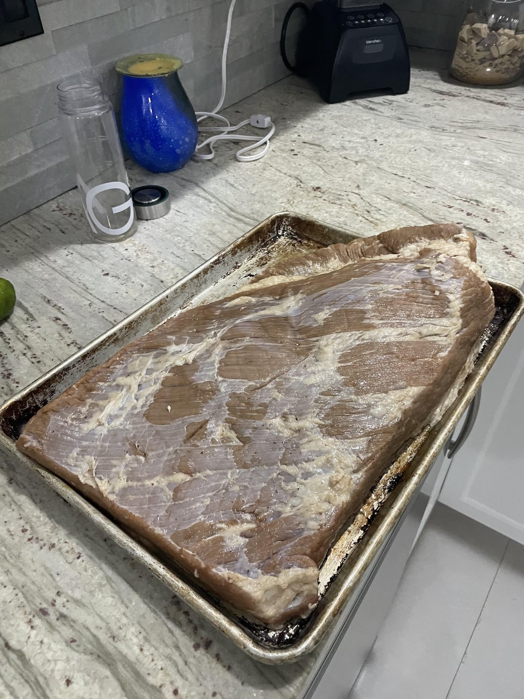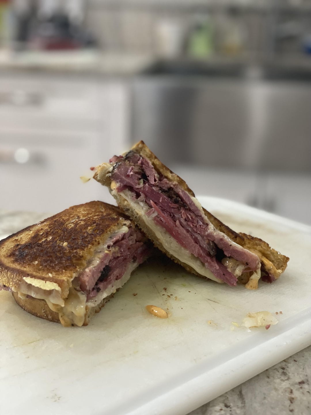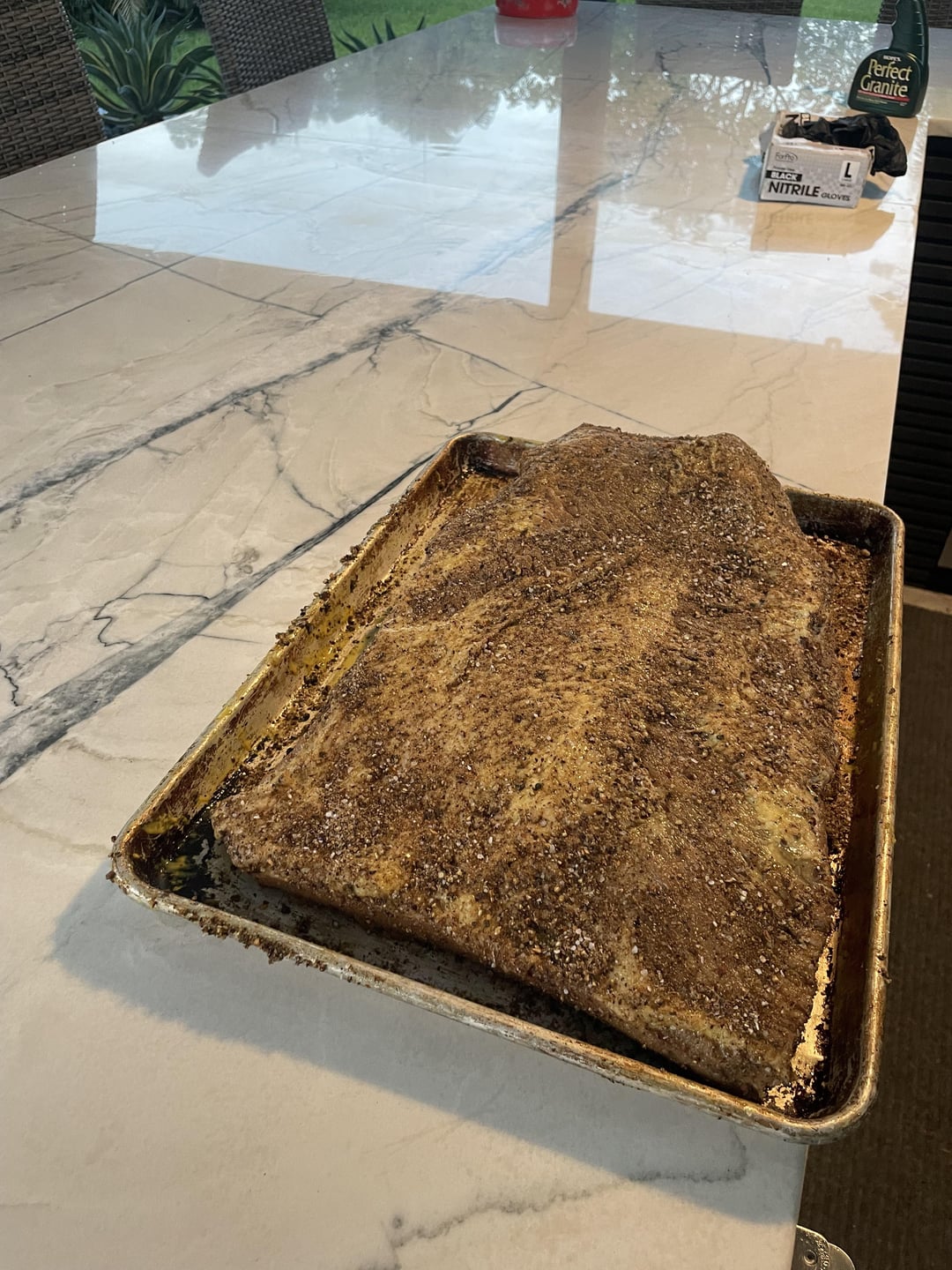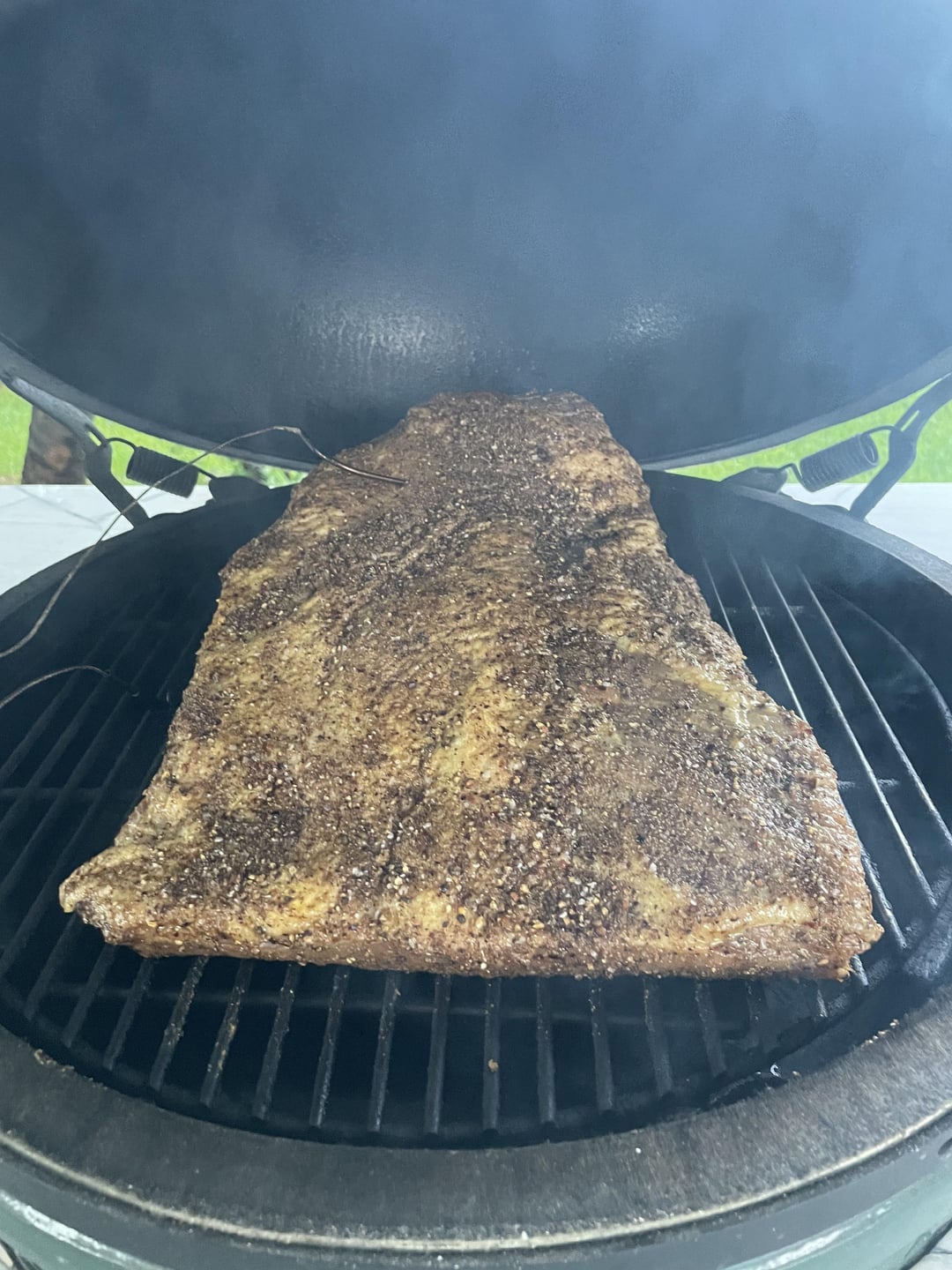 Brisket cured for 9 days in fridge, rinsed and soaked in water overnight. Coated in mustard and rubbed, put in the egg with some post oak chunks at 275 until it reached 199 internal in the point. About 6.5 hours and surprisingly no stall (maybe the high humidity?). Made Russian dressing from scratch, then grilled rye with swiss, sauerkraut, dressing and pastrami. It was amazingly good.