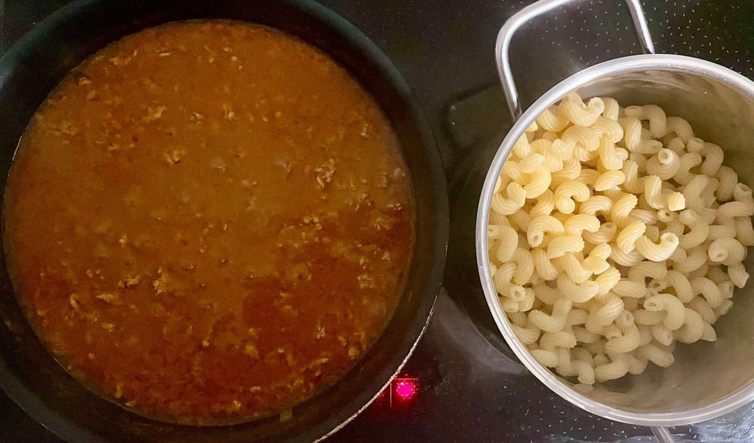 Add **3 tbsp. of olive oil** to the pan. Cook **500 g of mixed (beef/pork) ground meat**. When fully cooked add the onion mix and cook for 5 minutes. Pour **500 ml of stock** into the pan and bring to a boil.