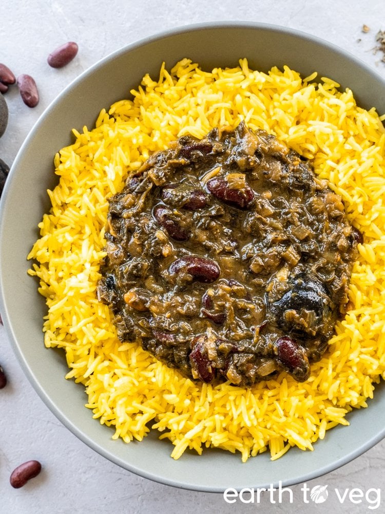 [Ghormeh Sabzi](https://earthtoveg.com/vegetarian-ghormeh-sabzi/), or Persian Herb Stew, can be considered the national dish of Iran. Serve with lots of tahdig or basmati rice. (Rice pictured above is cooked with turmeric cuz saffron is out of my budget atm, but still tasted pretty good)