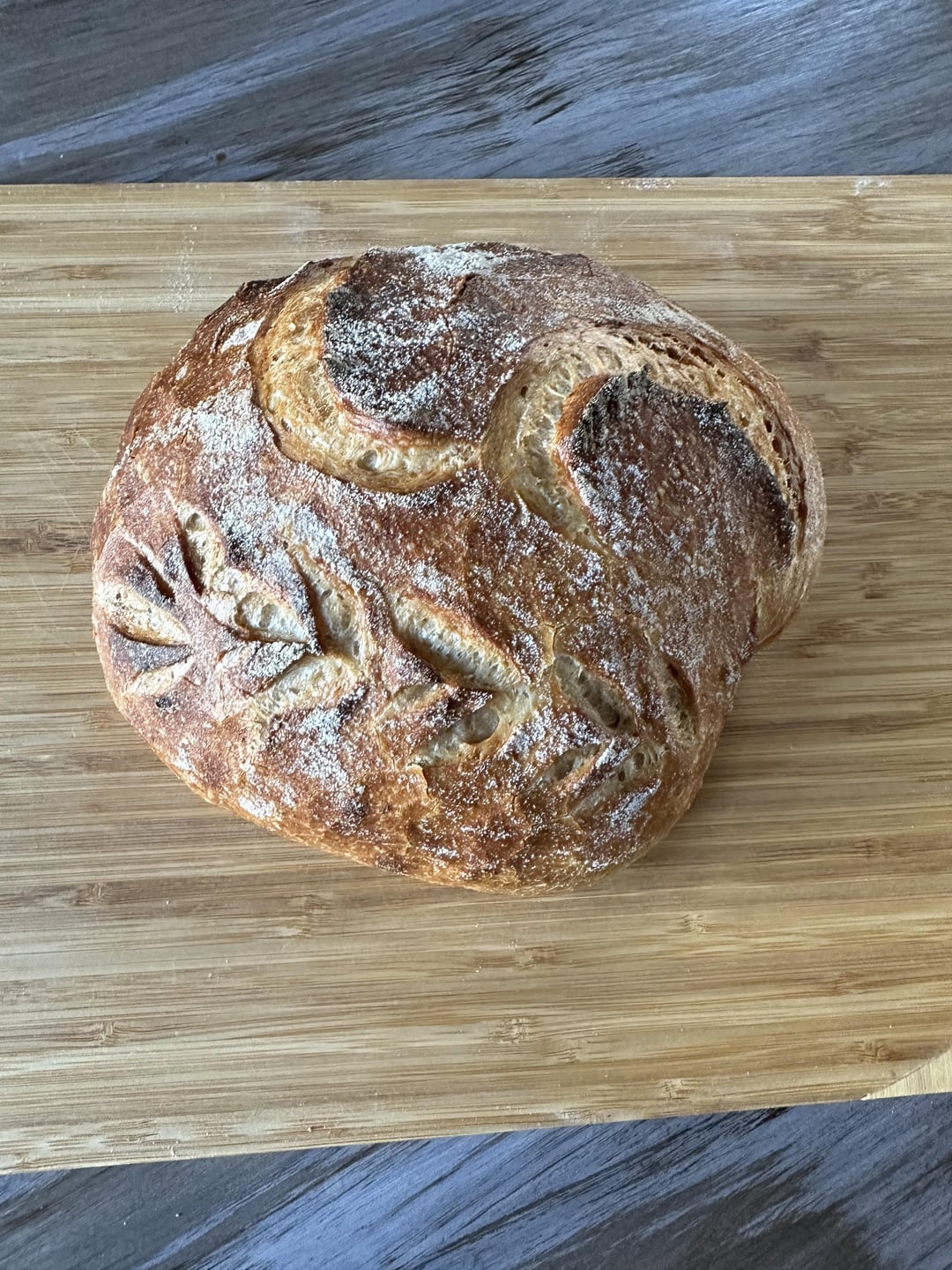Placed on small lid of combo cooker. Dusted with rice flour then scored using my Wire Monkey UFO lame. Scoring could have been deeper. I thought I nailed it but nope. Lol