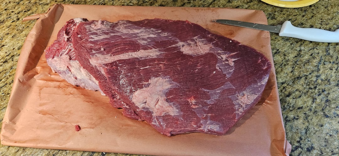 Around 10 lbs after trimming, salt/pepper/onion powder/garlic powder/ BBQ seasoning (name escapes me right now…).