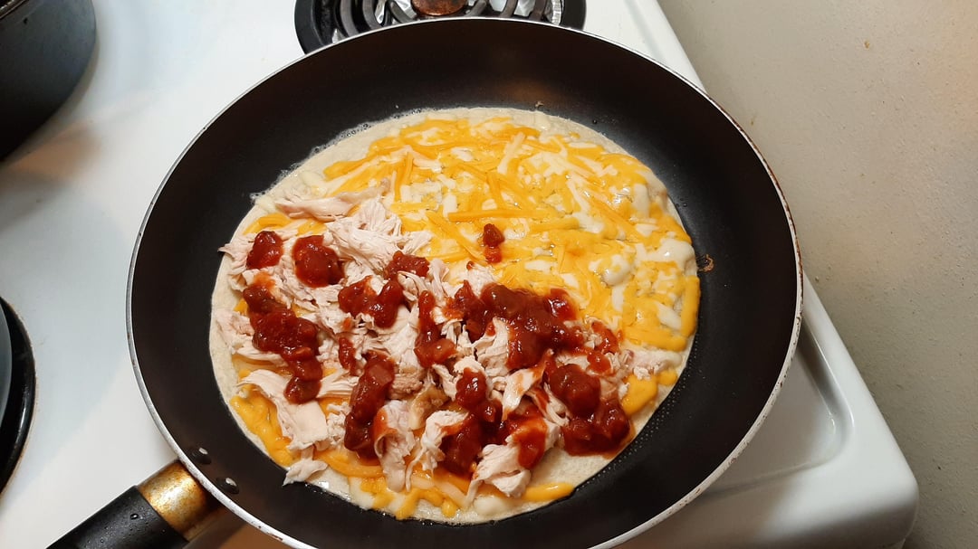 Texmex blend of cheese, shredded chicken and salsa. Forgot to chop up some cilantro and jalapeños and chuck it in there as well. Salsa and queso for dipping. Didn’t have time to make Pico de Gallo or guacamole. The kids thoroughly enjoyed it though.