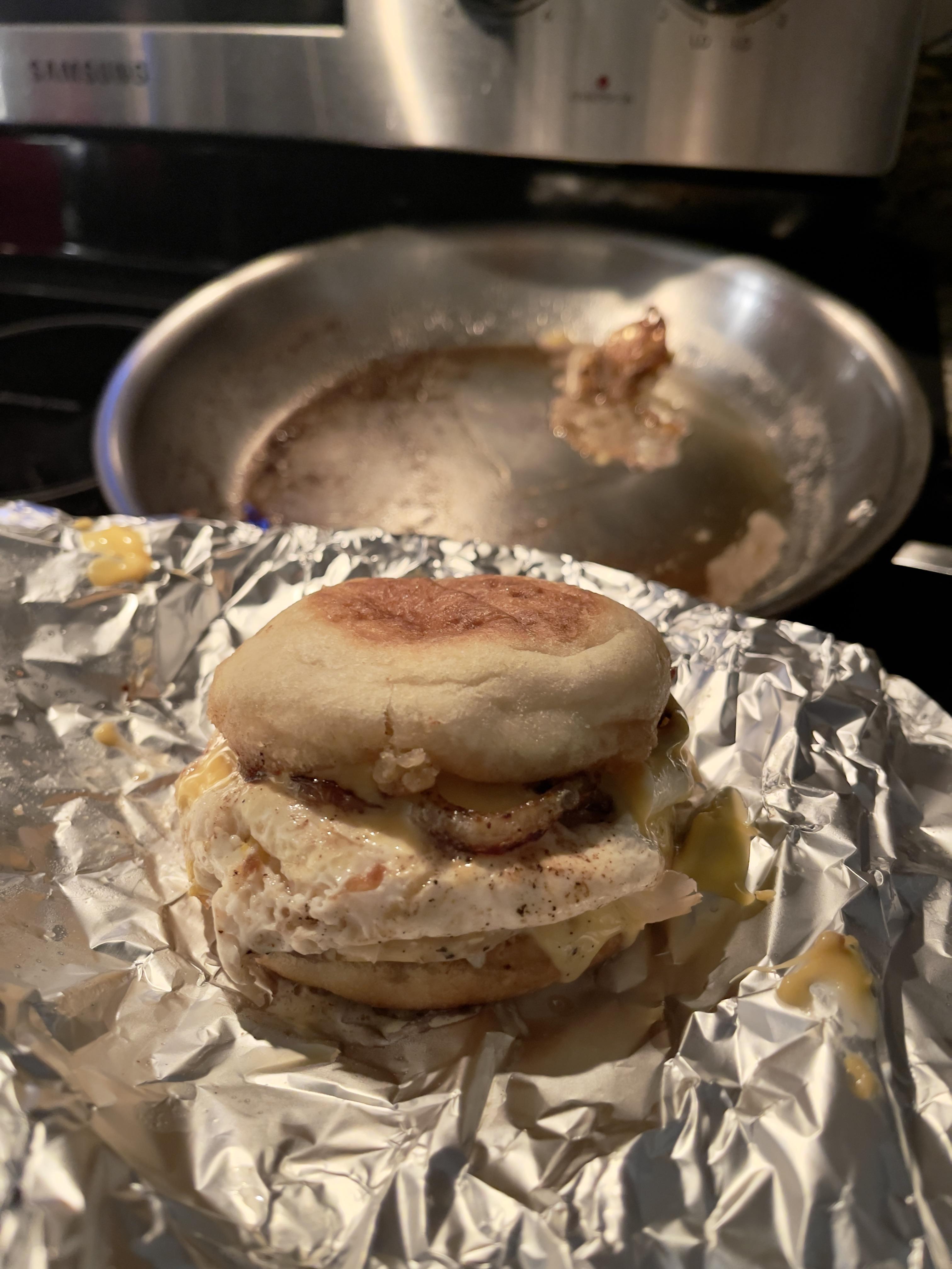 Then I stack pork on bottom English muffin, followed by American cheese slice, egg, sautéed onion, cilantro, dollop of sour cream, and finally second American cheese slice before topping with English muffin, wrapping in foil, and throwing in the oven at 250 for five minutes.