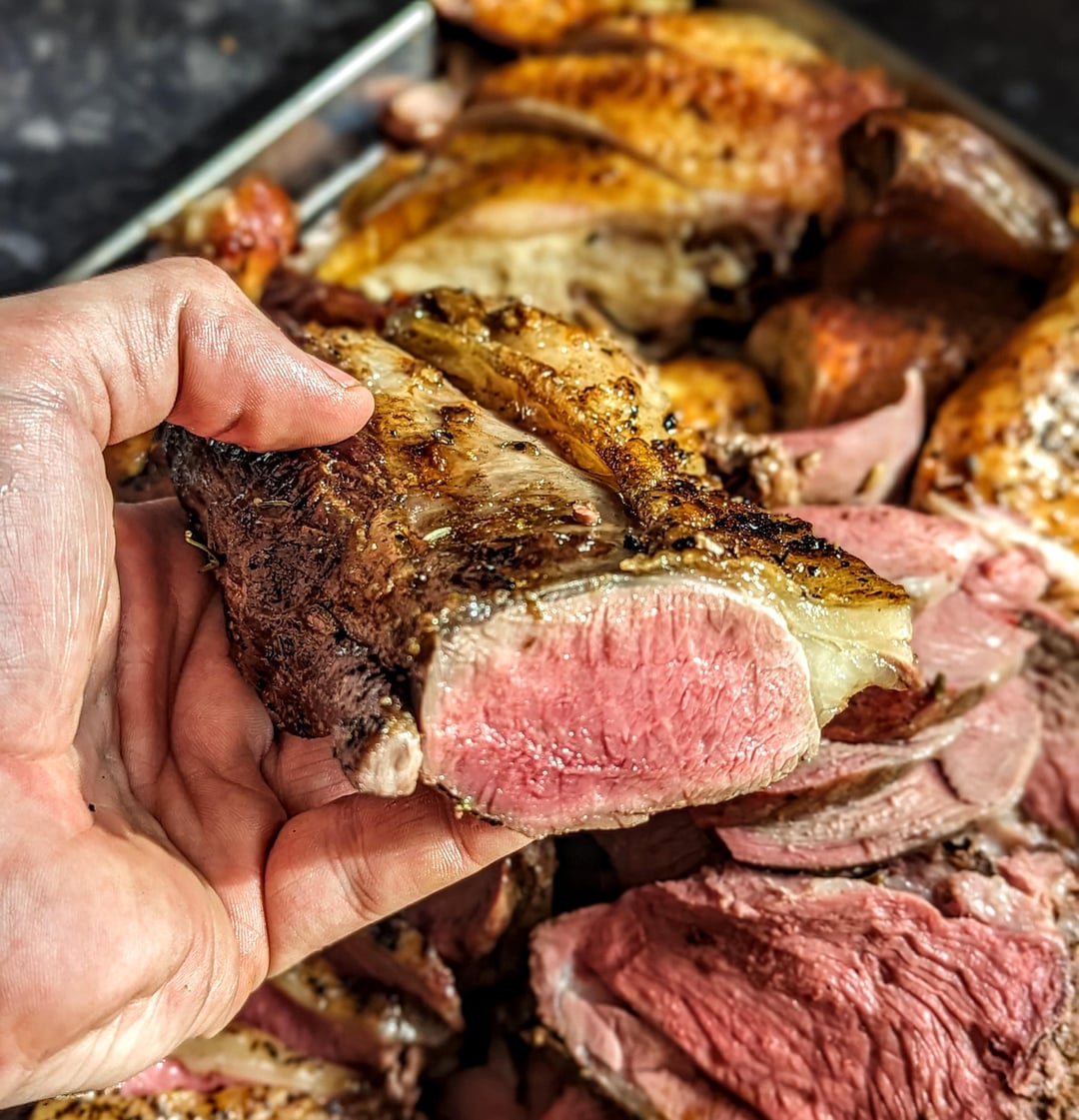 Middle pink meat is Hogget leg, deboned and cumin rubbed.