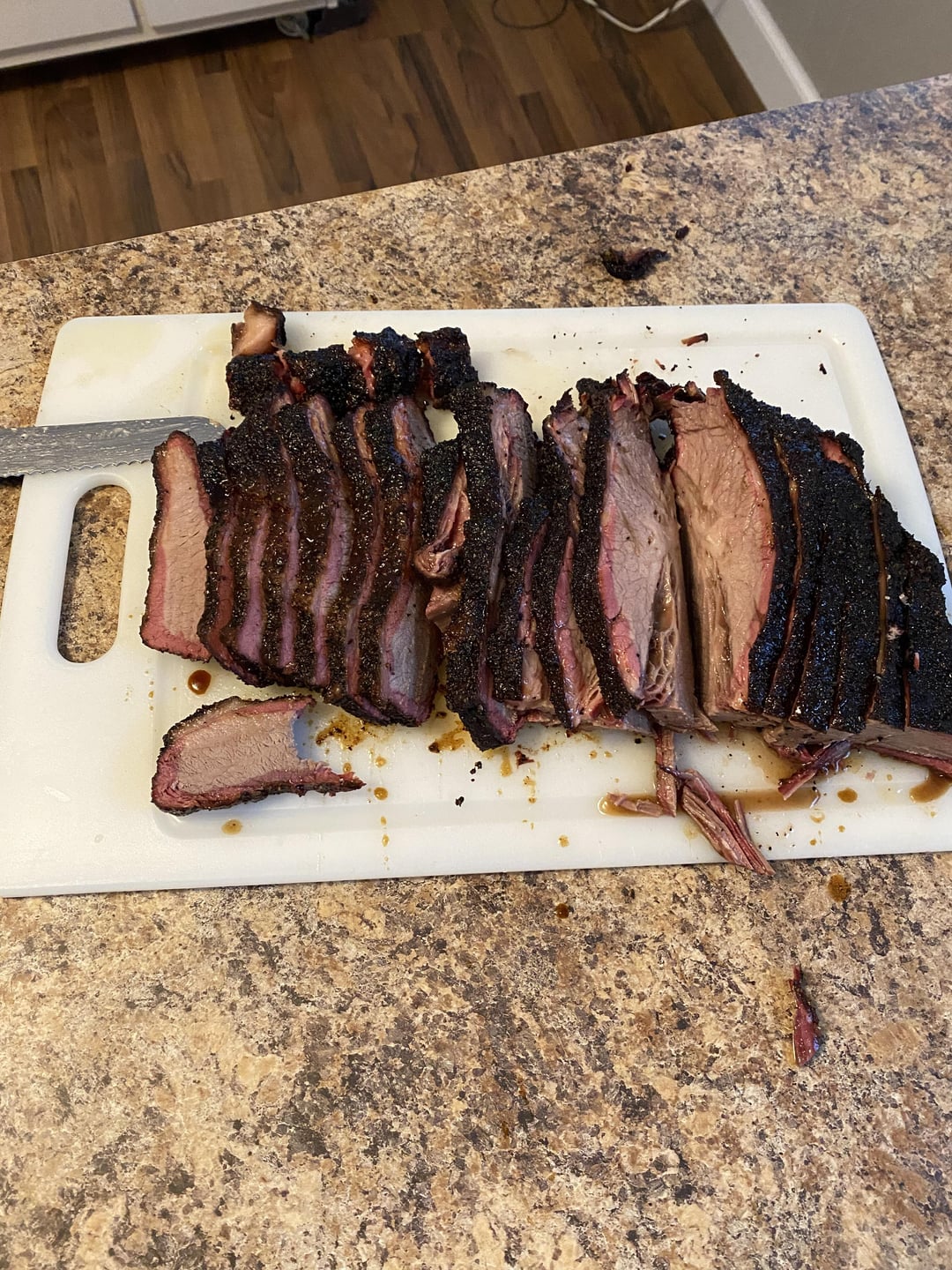 First Brisket this weekend. Went with the Matt Pittman method of 200° overnight. Wrapped in butcher paper once the flat hit 165° bumped temp to 250° until flat was 190°ish. Then Let it rest for a few hours in a cooler. I was happy with bark and flavor but the fat in the point had not rendered all the way resulting in chewy bites. Any feedback would be appreciated!