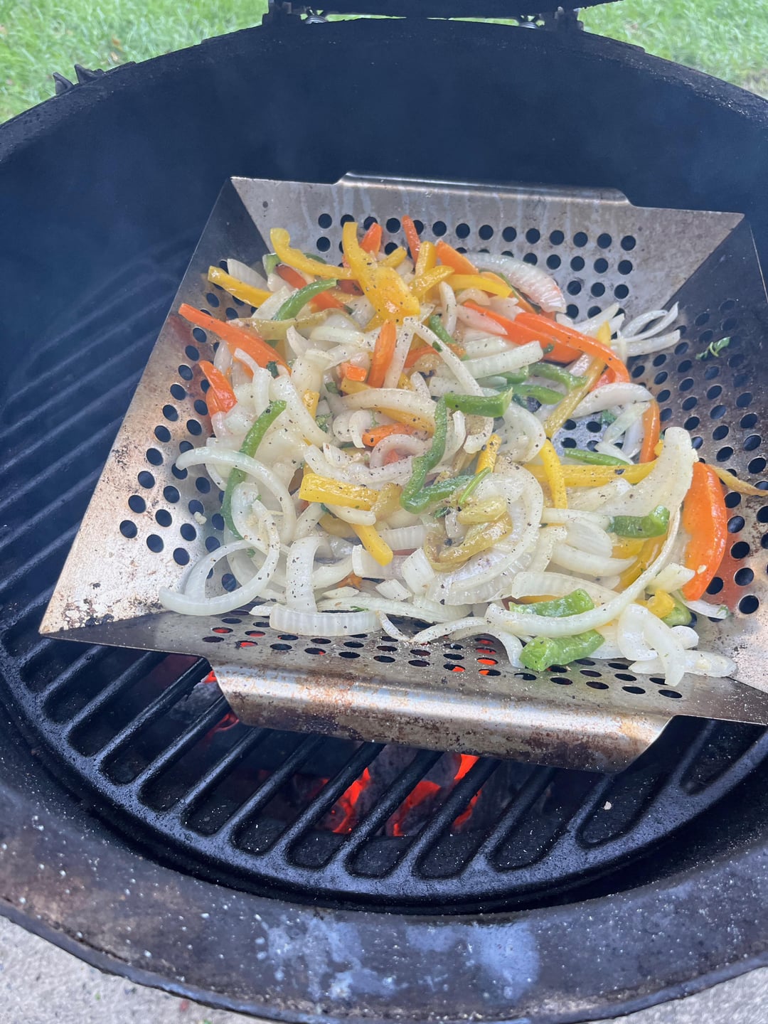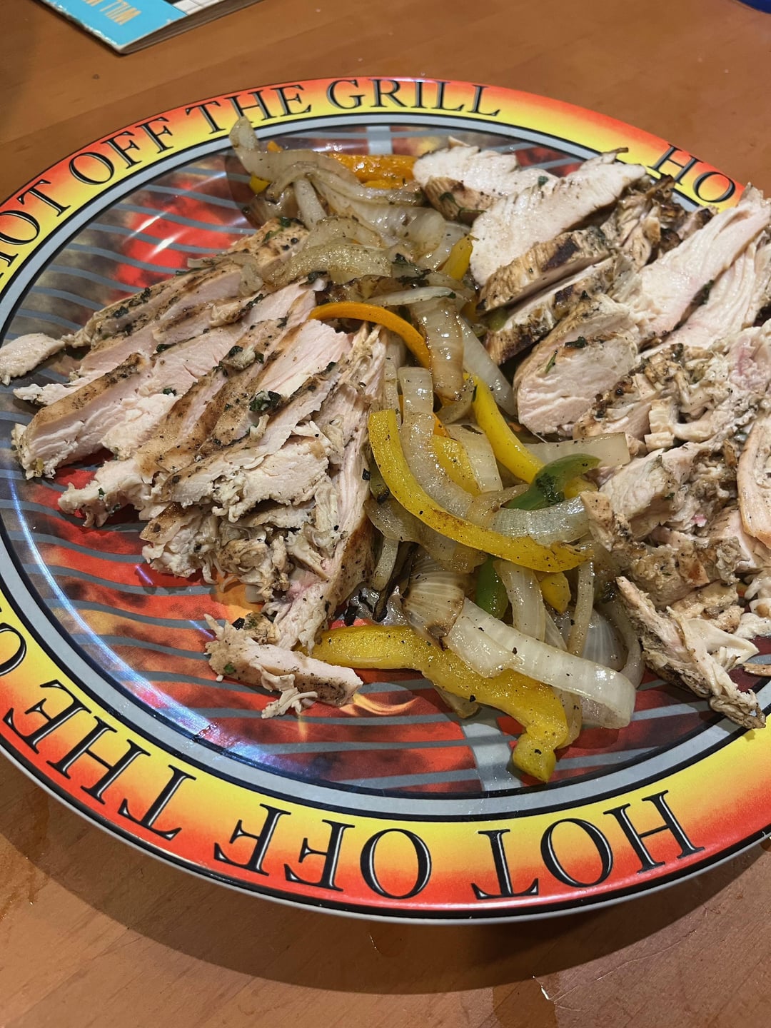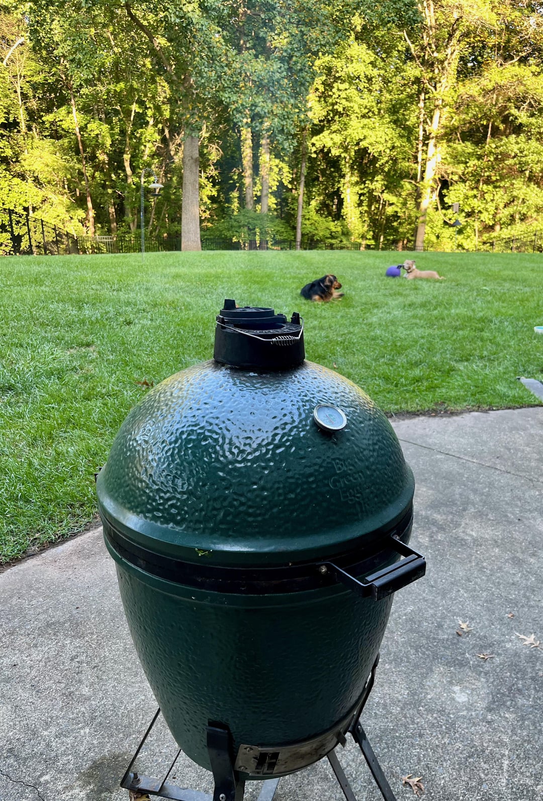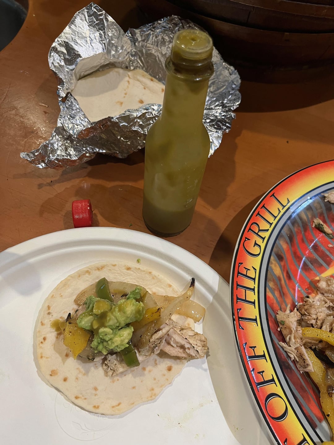 Cooked chicken fajitas on my old egg hanging with my pups on a perfect Maryland night. Chicken breasts marinated for a few minutes in lime, cilantro, oil, garlic, cumin, brown sugar with onion and assorted peppers. Served up with some homemade hot sauce and guac.