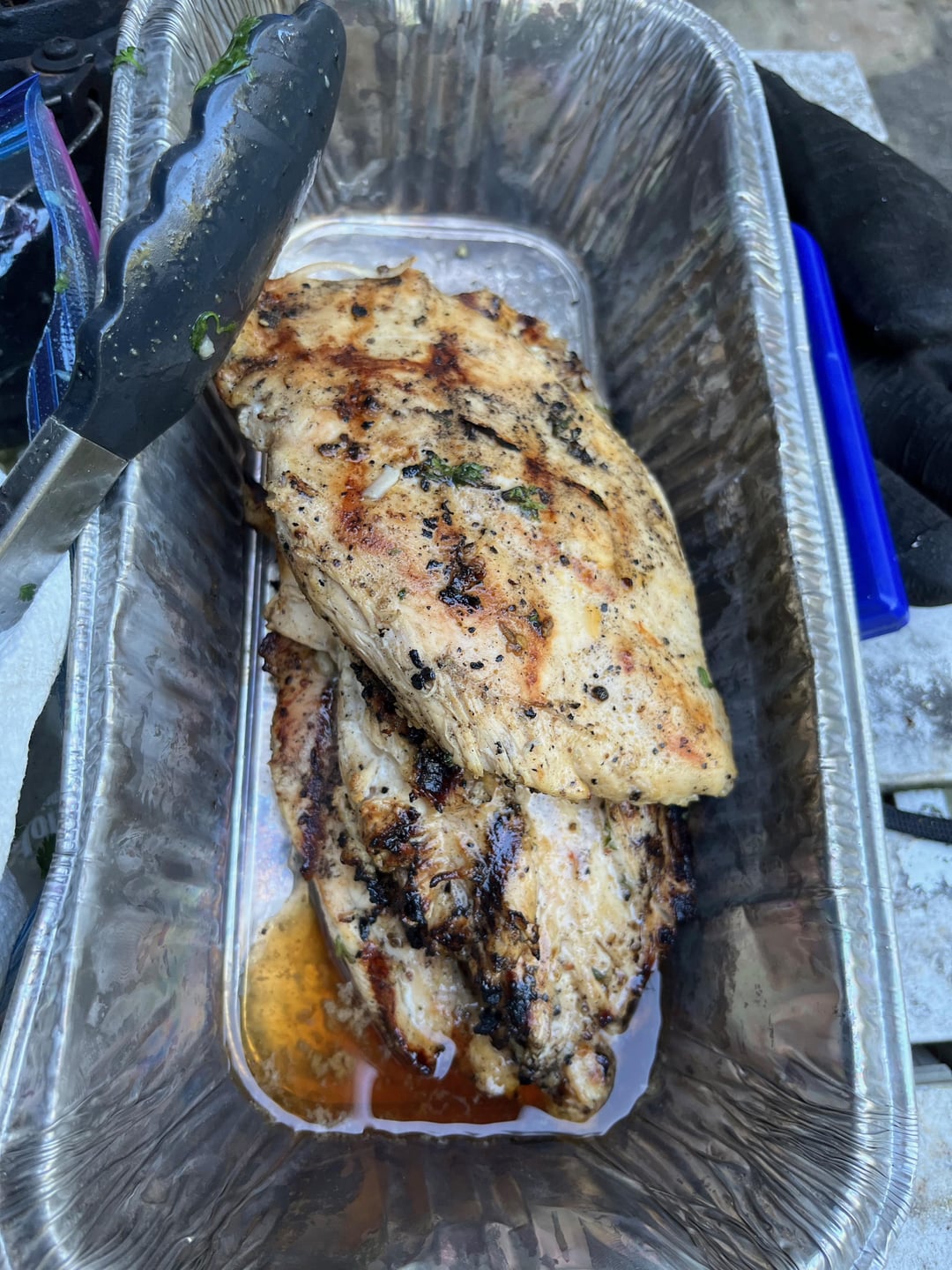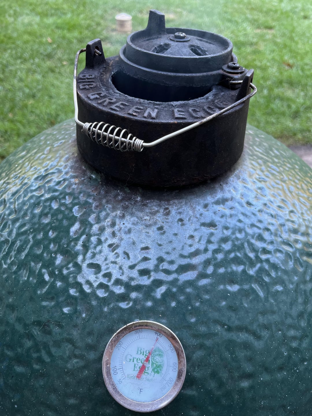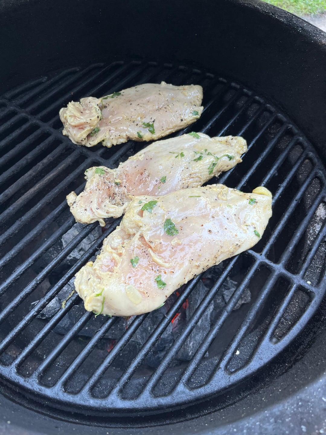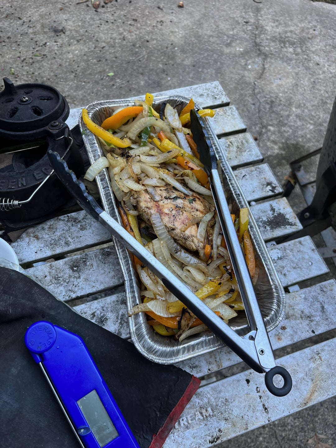 Cooked chicken fajitas on my old egg hanging with my pups on a perfect Maryland night. Chicken breasts marinated for a few minutes in lime, cilantro, oil, garlic, cumin, brown sugar with onion and assorted peppers. Served up with some homemade hot sauce and guac.
