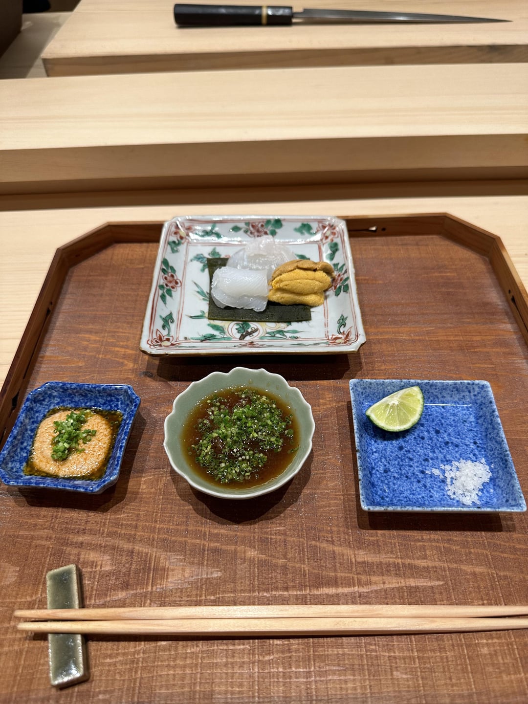 Three sashimi (uni from Chiba, karei, aorika) – highest quality ingredients matched with ponzu sauce, ankimo and sudachi 4.5/5)