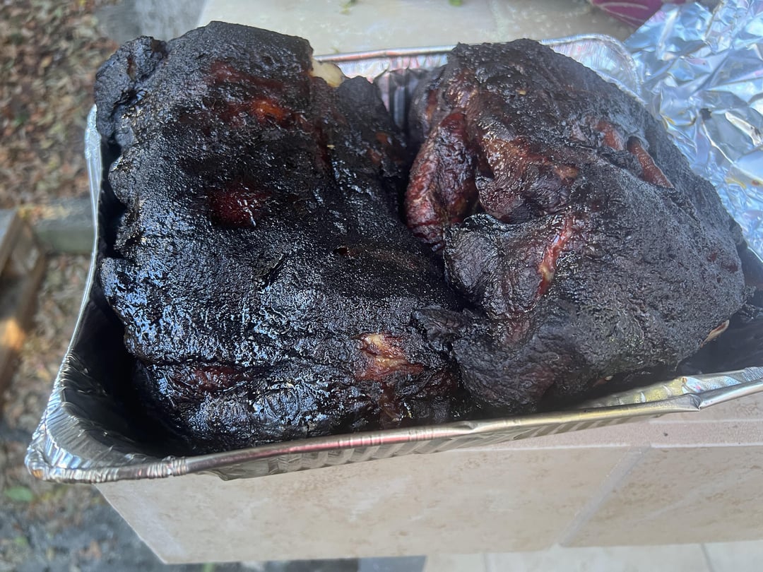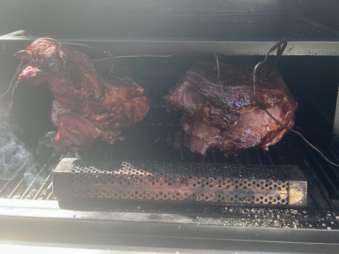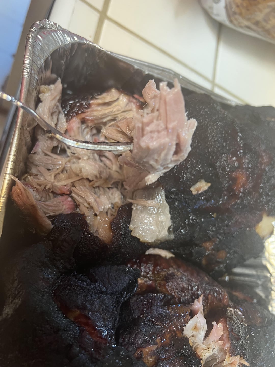Pork shoulder started at 7:30am. Finished around 4pm. Put into the cooler for 1 1/2 hours to rest. Wrapped it in blankets. I now have a new definition “of fork tender”.