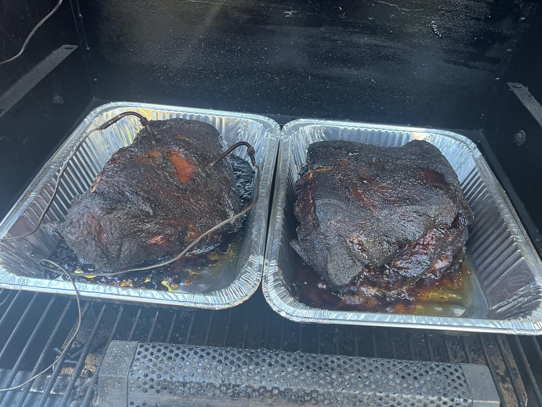 Smoked it on the grates until 165 ℉ then moved to aluminum chaffing dish(disposable). Continue cooking at 275 ℉ until probe temp was 205 ℉ and was probe tender.