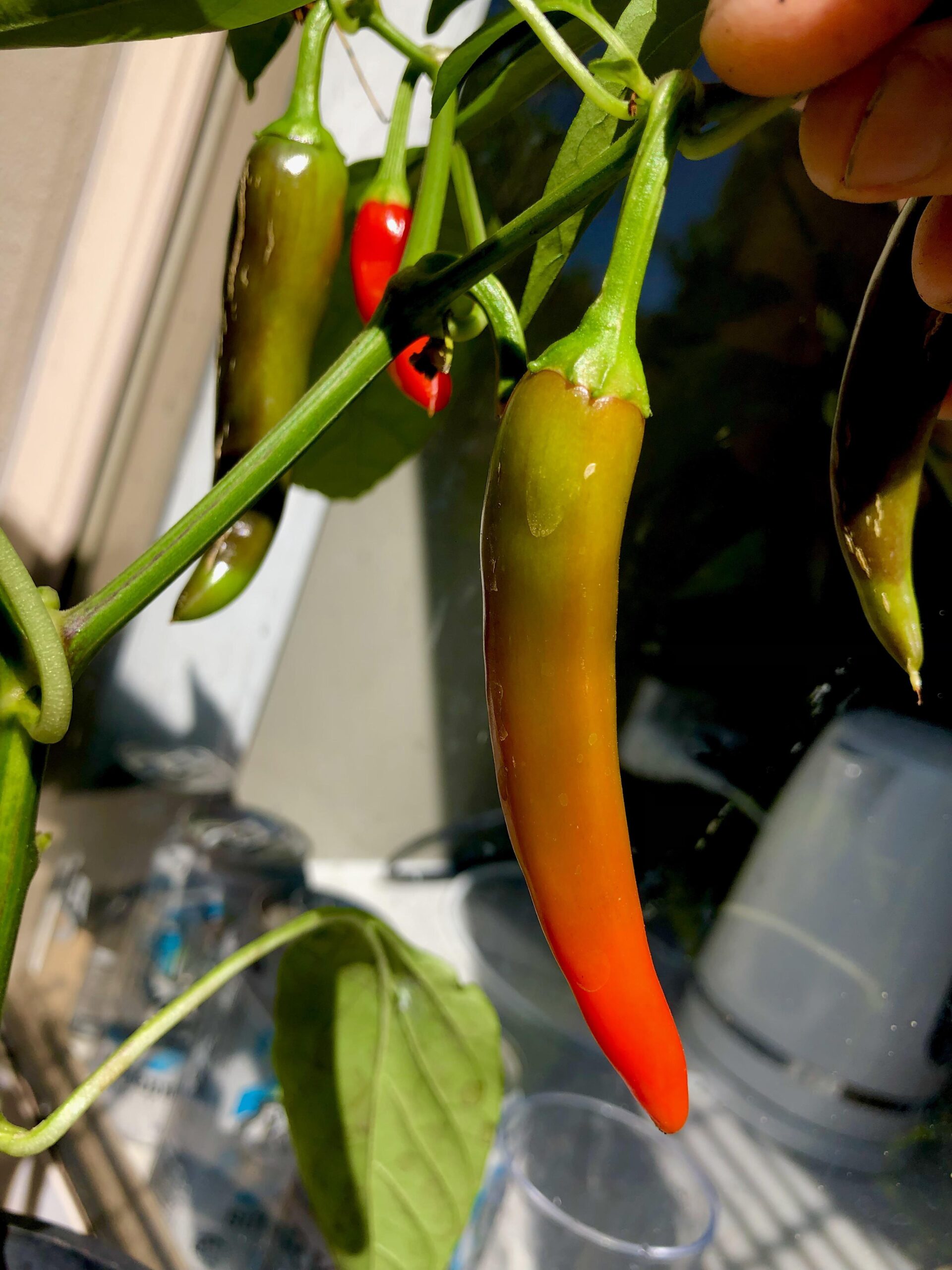 As a new hot pepper grower I have been surprised at just how much I have enjoyed watching the transition through the various colors as they ripen. The one in the photo starts a deep black, goes to purple, then green and eventually red. The species is suppose to be one of those Chinese Space Chillies, but I am not too sure. It is very mild.