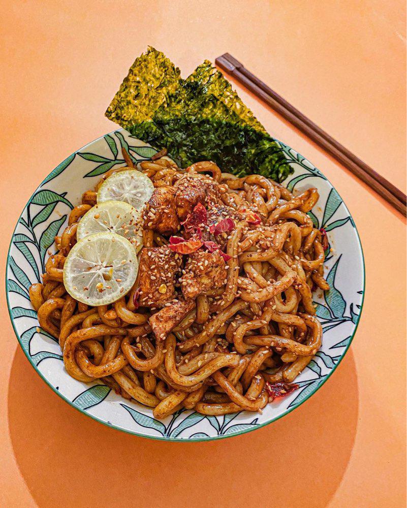 Ingredients: Udon noodles you can replace this with any type of noodles if you can’t find udon, chicken boneless, salt, brown sugar, ground black pepper, dark soy sauce, soy sauce, sesame oil, vegetable oil for frying, Tabasco sauce, garlic chopped, 3 leaves nori seaweed for garnish, optional lemon for garnish, red chillis sliced, lemon juice, toasted sesame for garnish