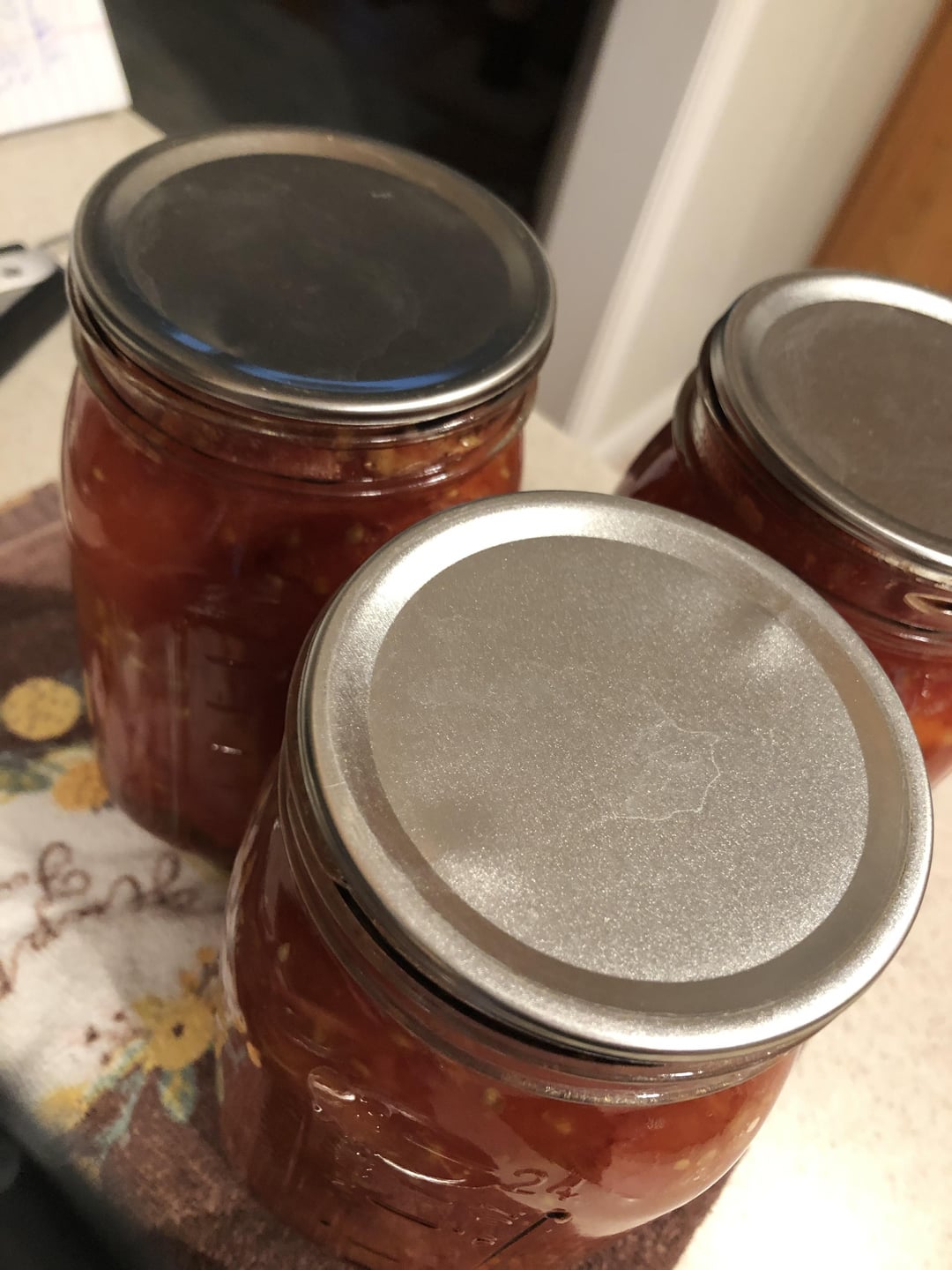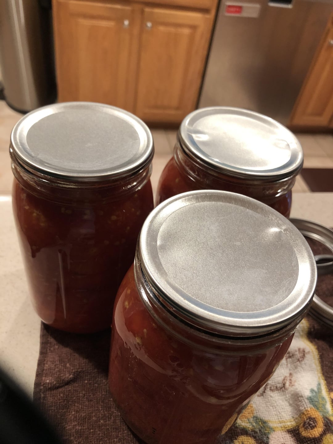 First time canning and I canned some tomatoes. I bought jars that came with lids and bands and used those lids. Made 3 jars. The lids are sealed but do have these raised spots on them. Should I just open and eat the tomatoes (in the jars with the raised spots) now or can I store them even though they have raised spots in the lids? 1 jar has a smooth lid; the other two have raised spots. See pics.