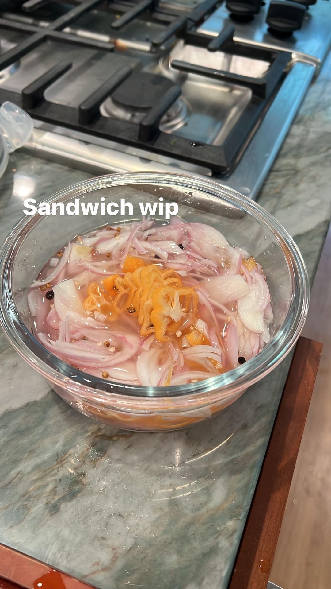 Grilled chicken sandwich with dressed heirloom tomato, sartori montamore, avocado, and pickled shallots and habanero pickled in rice wine vinegar, mustard seeds, coriander seeds, fermented peppercorns, sugar, water, and salt