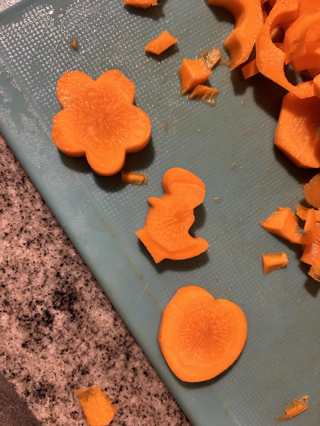 I bought little cookie cutters a while ago and used them to add some fun to my carrots! I’m excited to use them in soups this winter. Dinosaur was husbands request lol