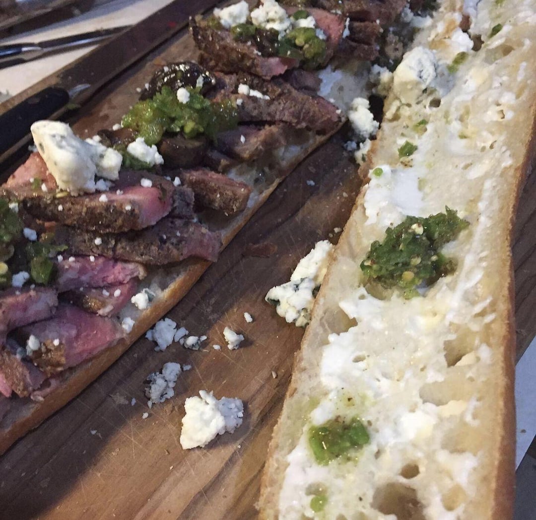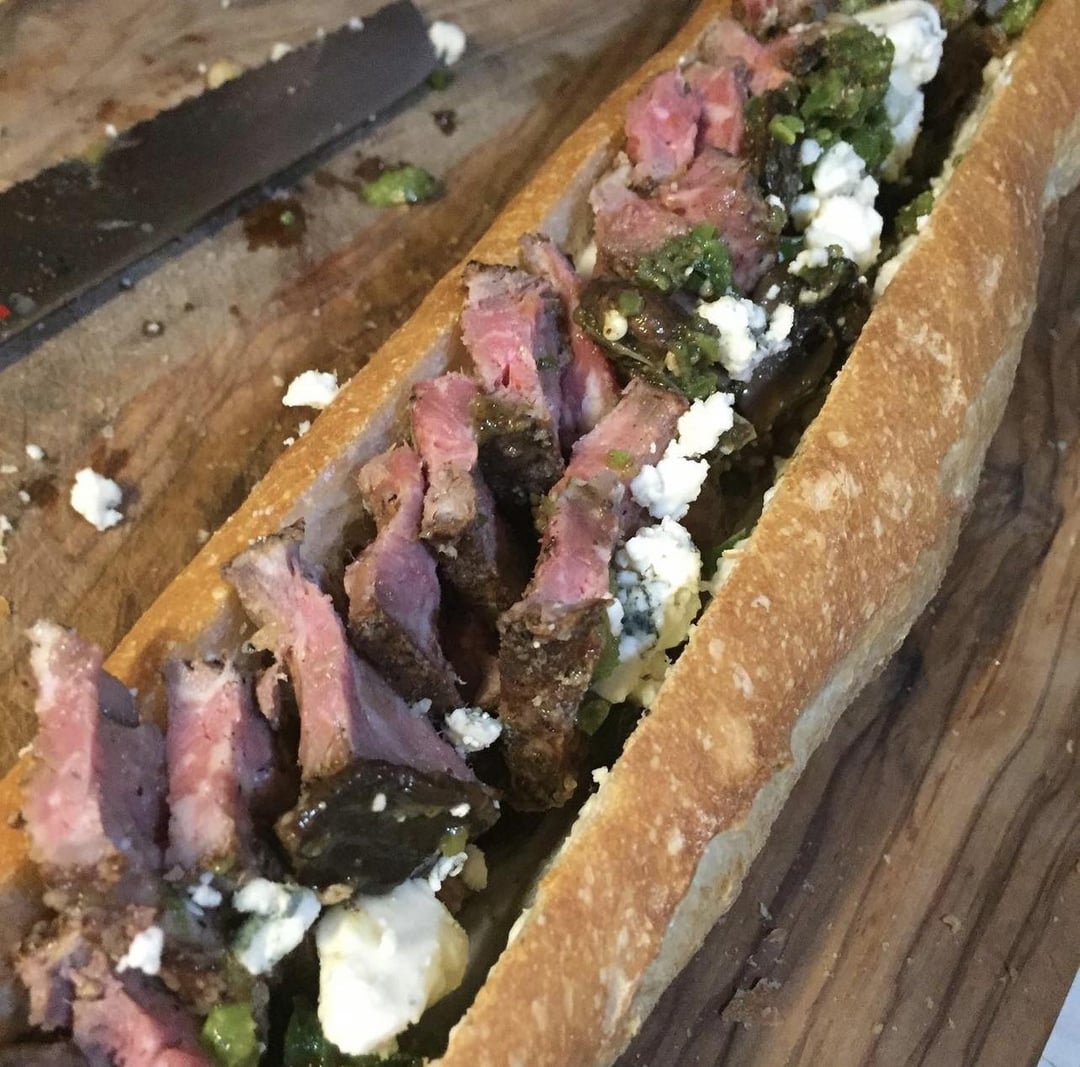 prime ny strip sandwich with garlic spread, schug, and societe bee Roquefort