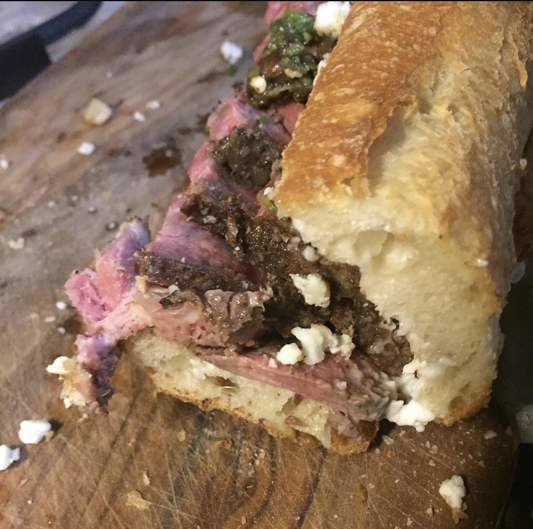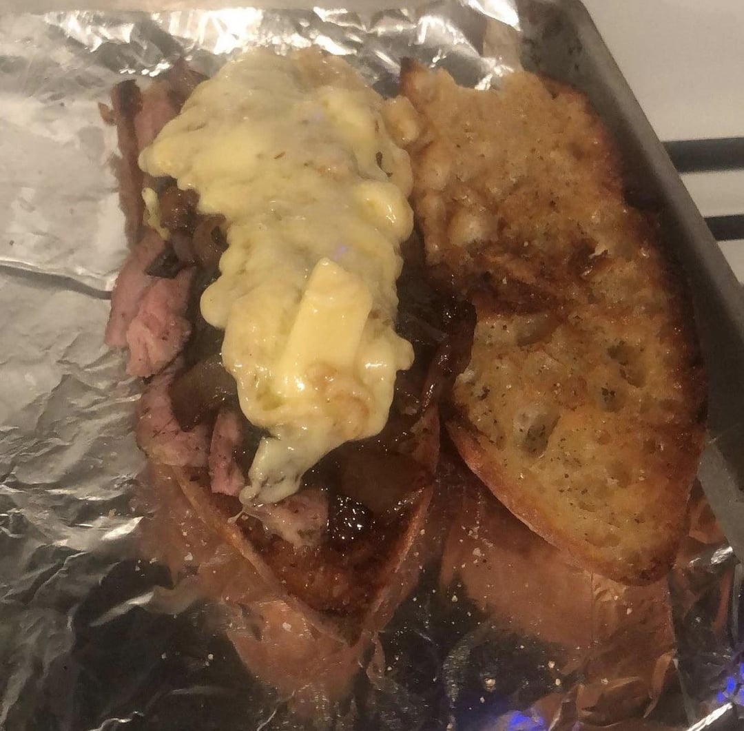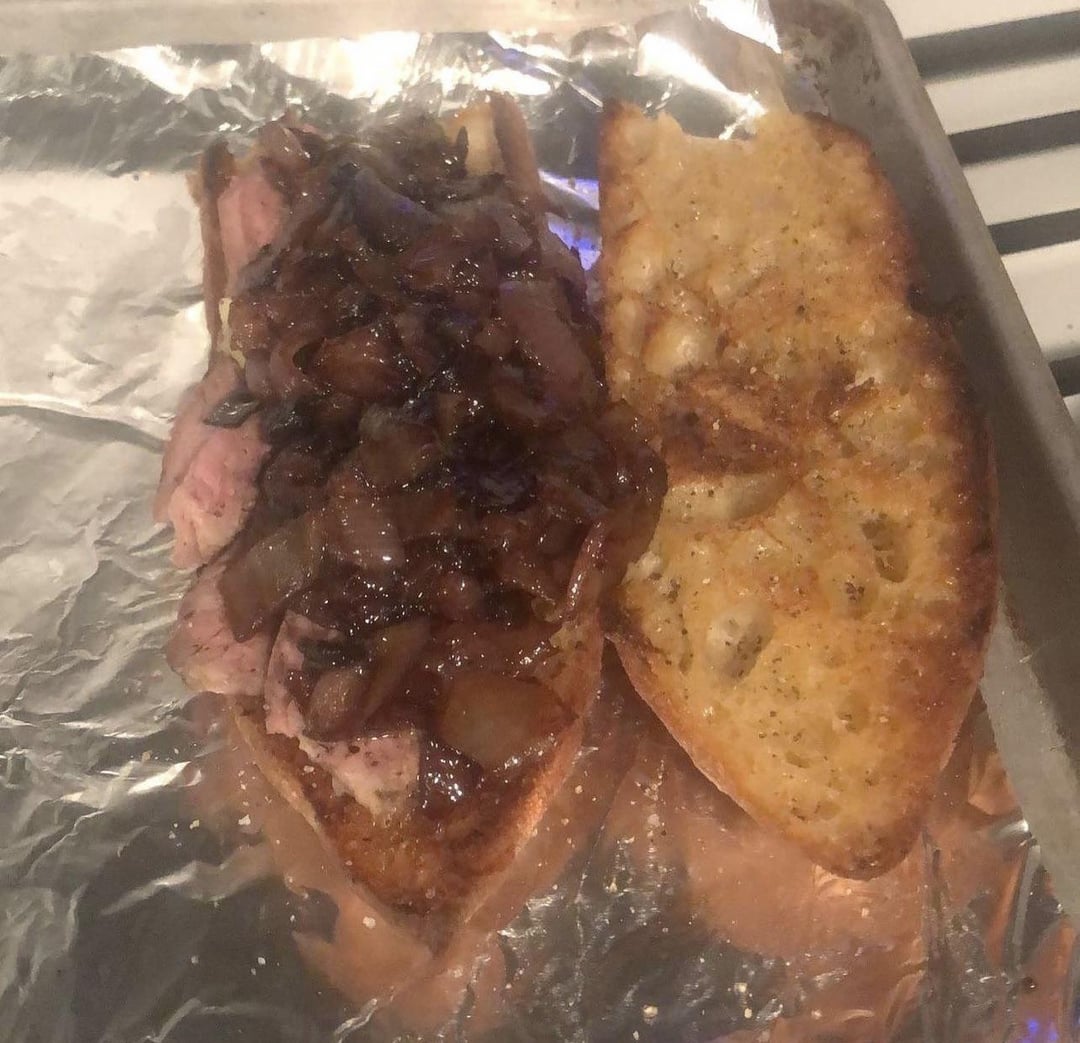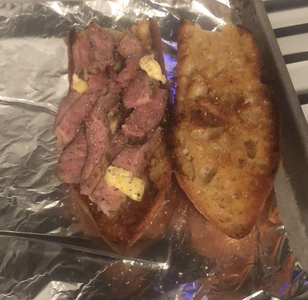 Cold ribeye sandwich with les pres sales camargue butter fried ancienne baguette, caramelized giusti Giuseppe modena balsamic vinegar “Banda Rossa” onions, a melted cheese mix of truffle gouda and gruyere, roasted garlic, and pepper