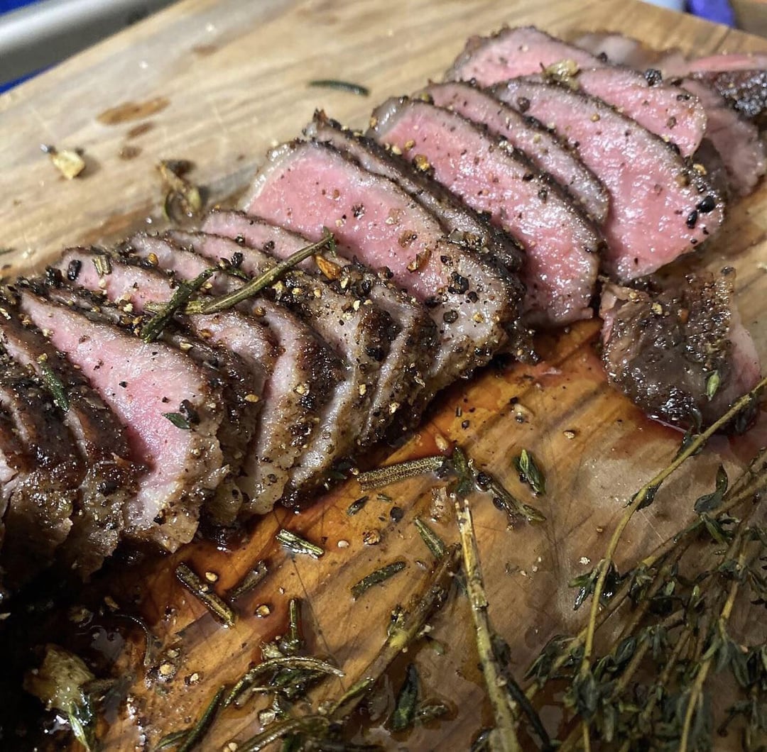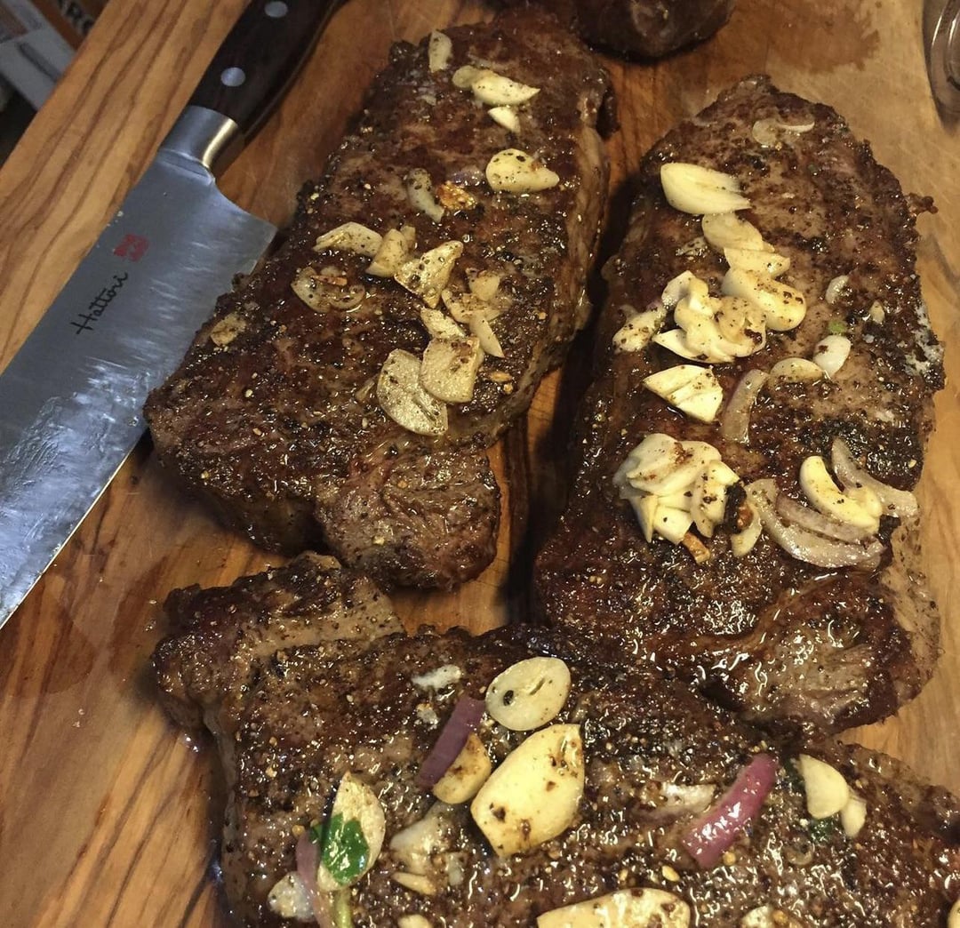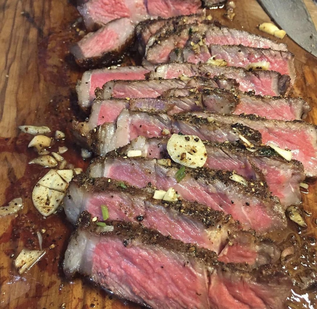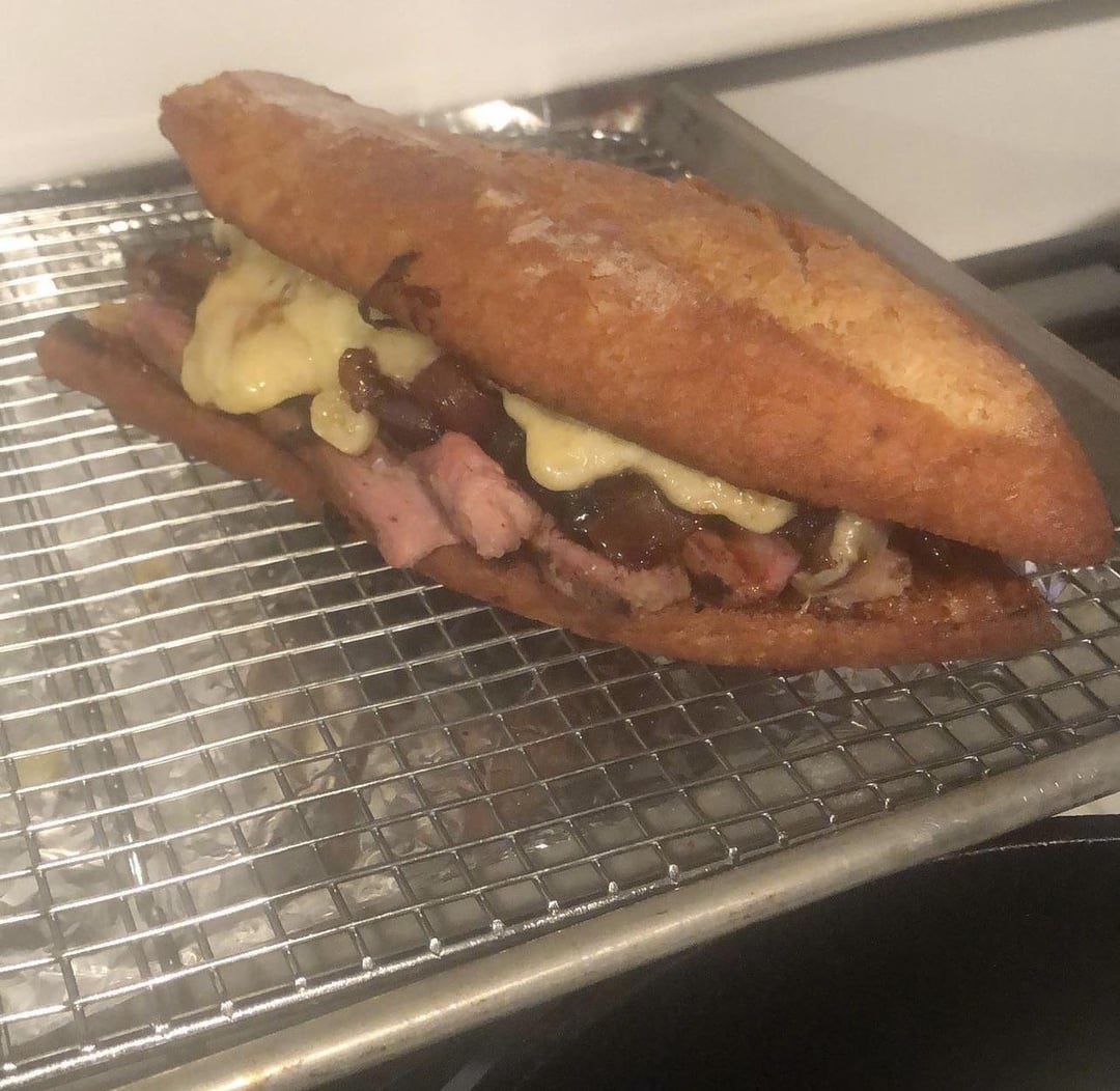 Cold ribeye sandwich with les pres sales camargue butter fried ancienne baguette, caramelized giusti Giuseppe modena balsamic vinegar “Banda Rossa” onions, a melted cheese mix of truffle gouda and gruyere, roasted garlic, and pepper