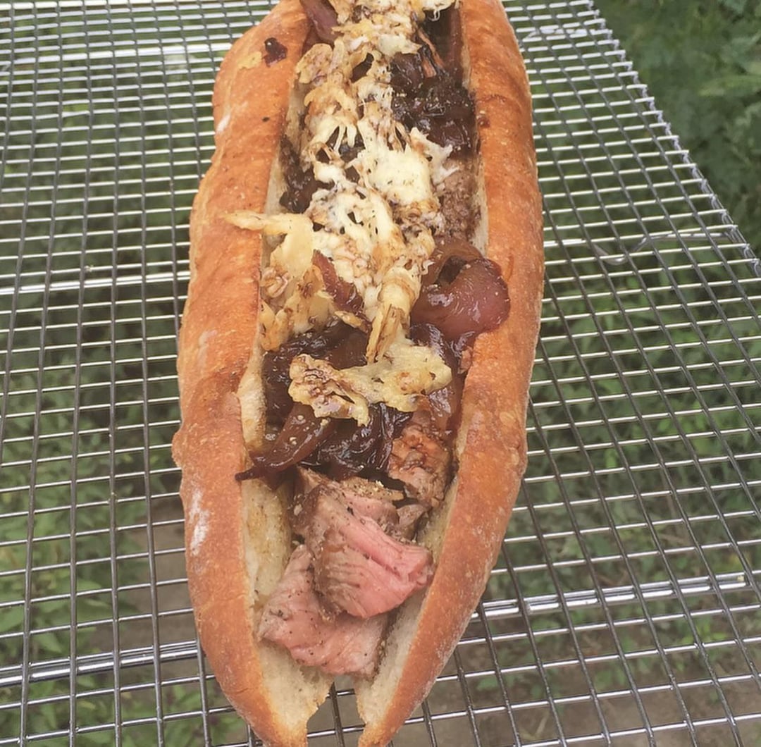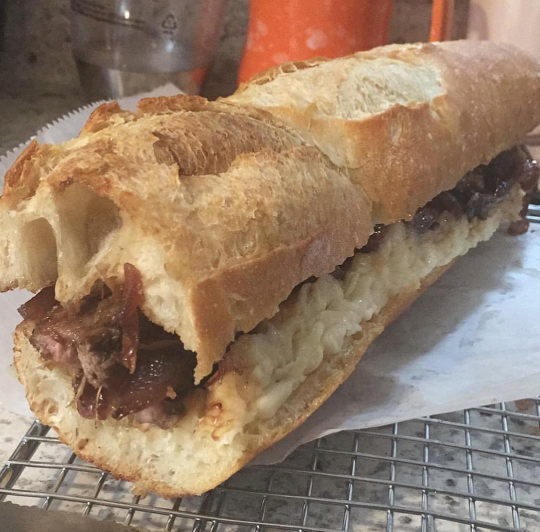 Ribeye and caramelized onions baked aged provolone, garlic, and plugra butter Demi baguette sandwich with pepper and Giuseppe Giusti Gran Deposito Aceto Balsamico Di Modena