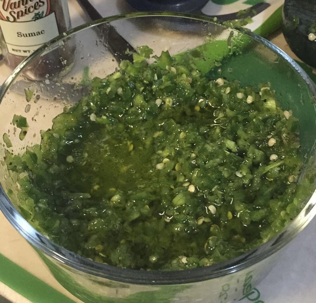 (The schug was made out of white wine vinegar, cane sugar, sumac, jalapeños, maldon salt, and cardamom) *old version I usually add cumin, cilantro, and sherry vinegar instead of white wine vinegar