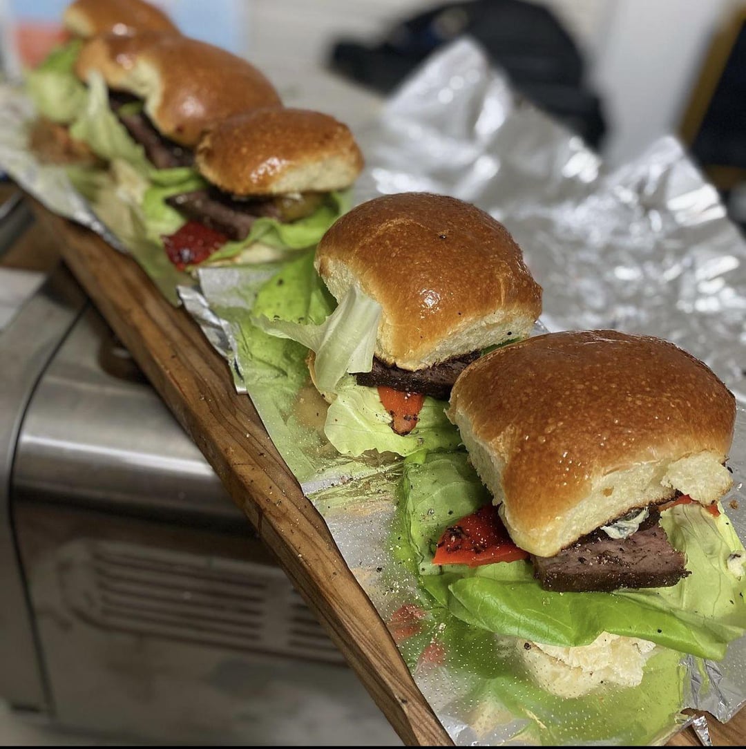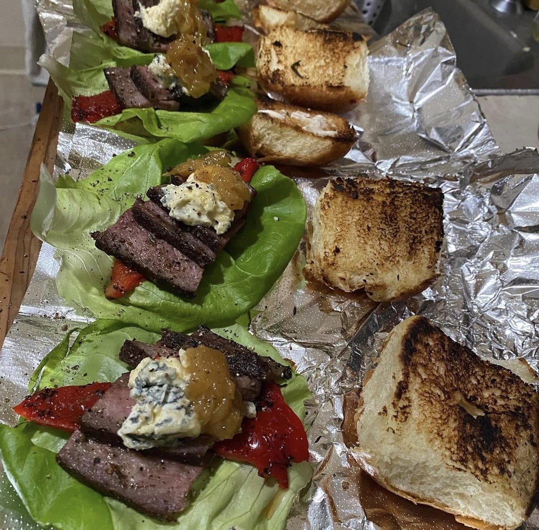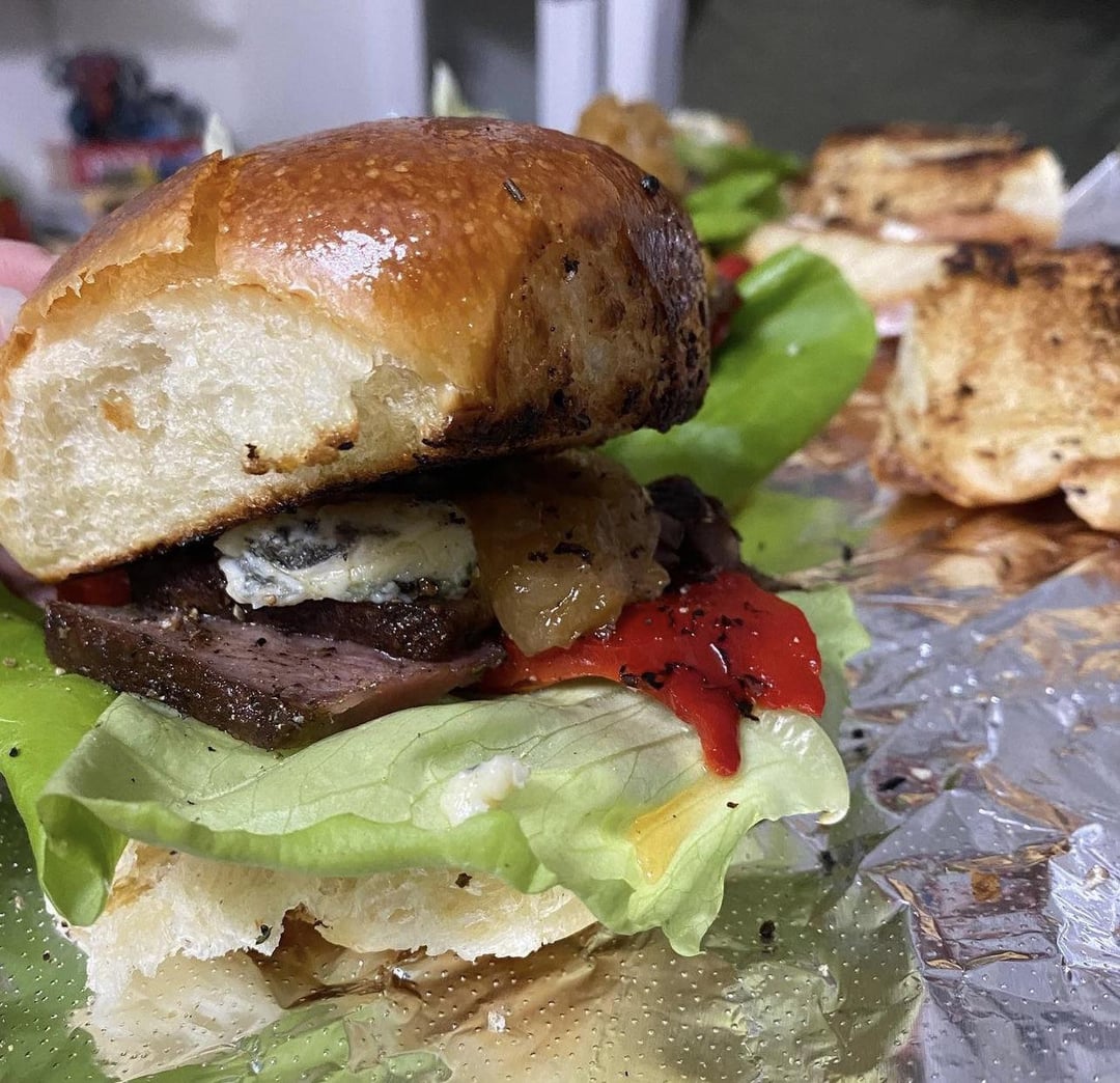 Leftover Dry aged ny strip steak juice crusted challah bun sliders with garlic toum, butter lettuce, roasted red peppers, caramelized onion jam, extra pepper, and saint agur