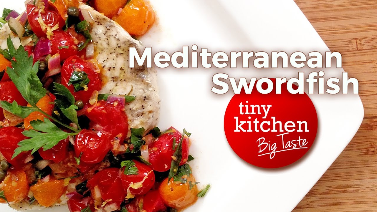 Happy, Happy, Happy! This Mediterranean Swordfish recipe is sure to make your stomach smile…and your heart, too, because you’ll be eating Mediterranean healthy! (See Ingredients/Full Recipe below and at www.tinykitchenTV.com)