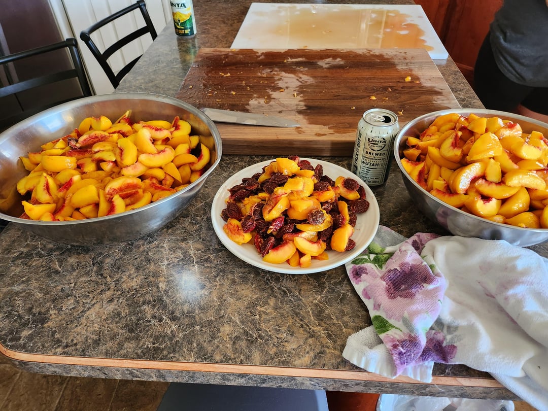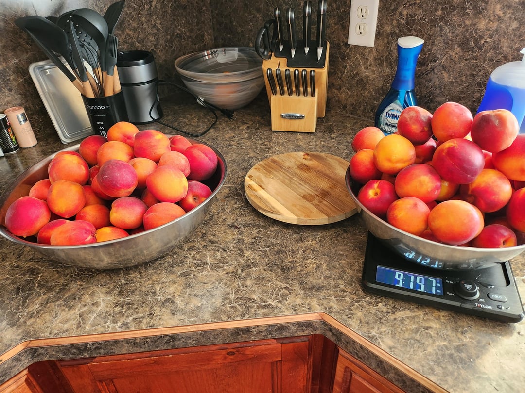 Went back to my neighbors tree and got about 20 more lbs of peaches. After throwing out bad ones, skinning, pitting, and eating a few on the side had about 13 lbs to cook with.