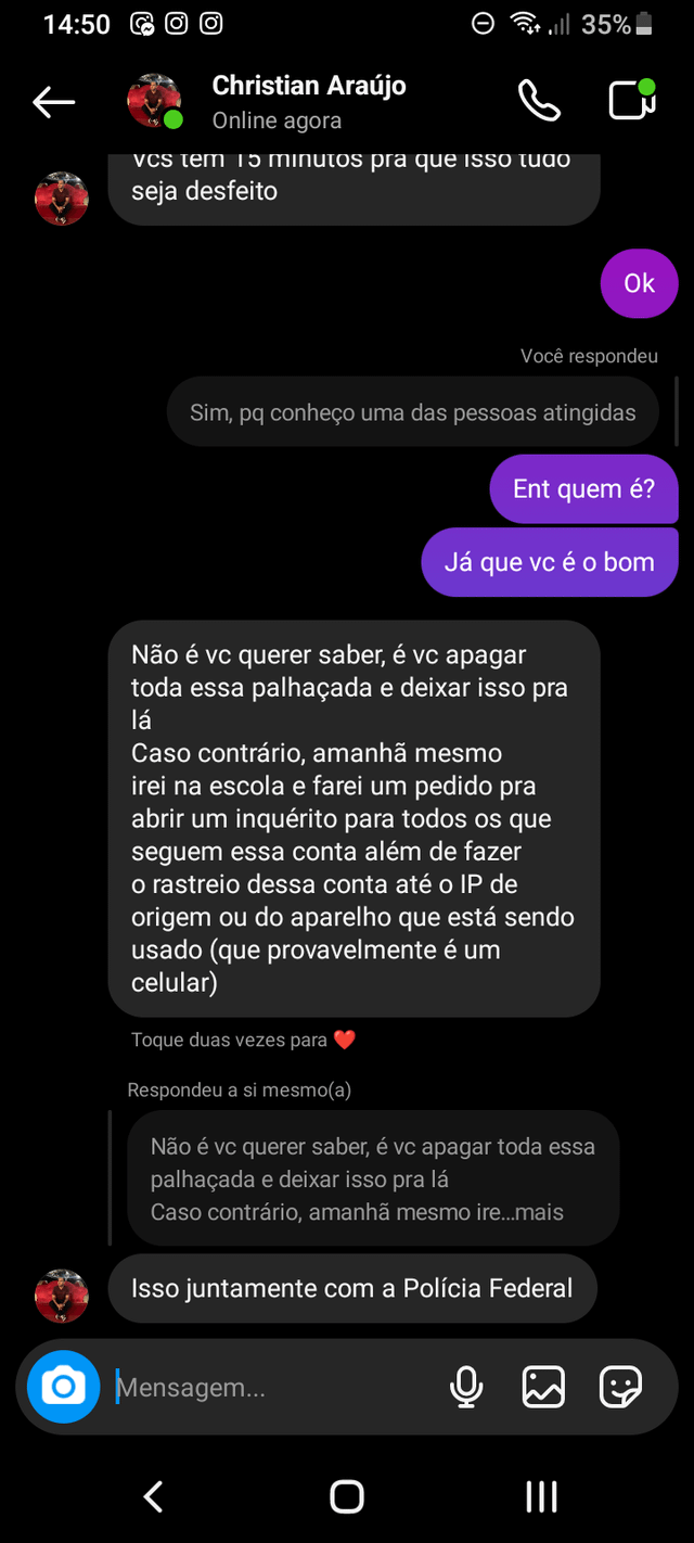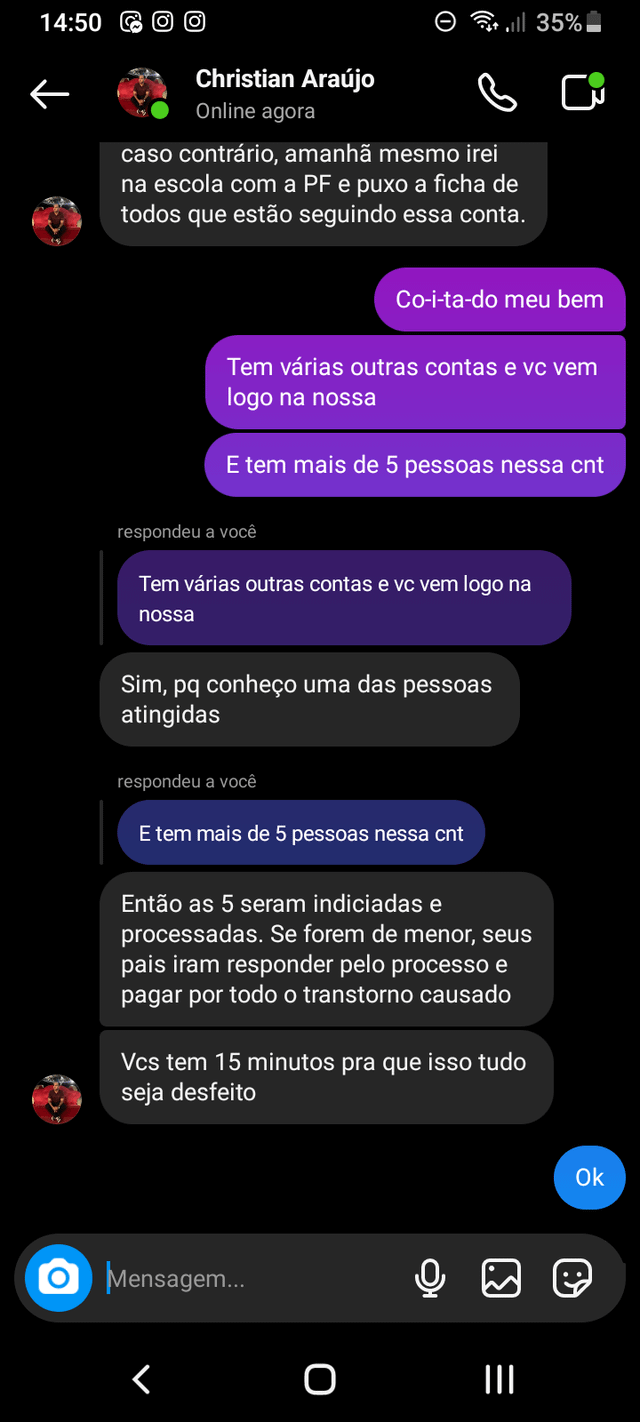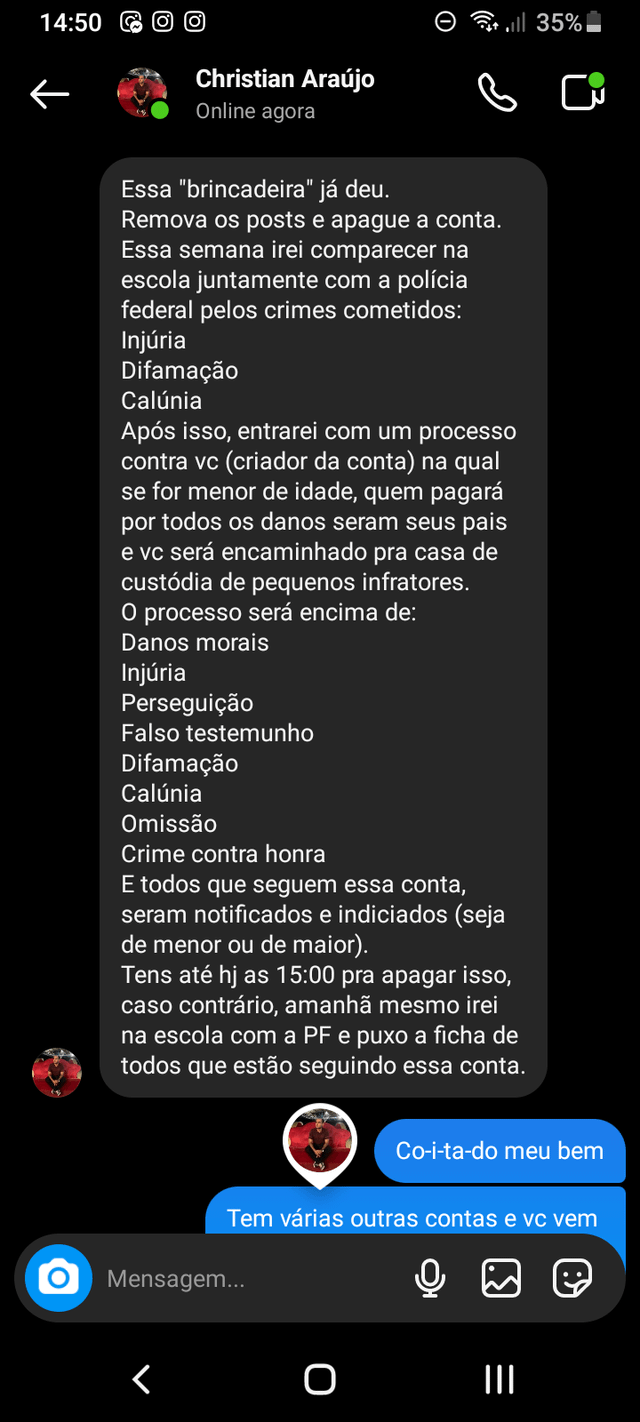 Ficamos o dia inteiro fazendo um monte fofocas de pessoas da nossa escola, ate que uma hora começo a “bricadeira” passou dos limites, ate um ponto que denuciaram agente para o prf , mas é claro que não descobriam que famos nos, mas eu me sinto arrependida pela merda que fizemso.