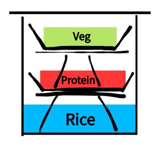 * Rice: cook, at most, a sixth of the cooker’s max capacity. You need room to stack the plates of protein and veg.