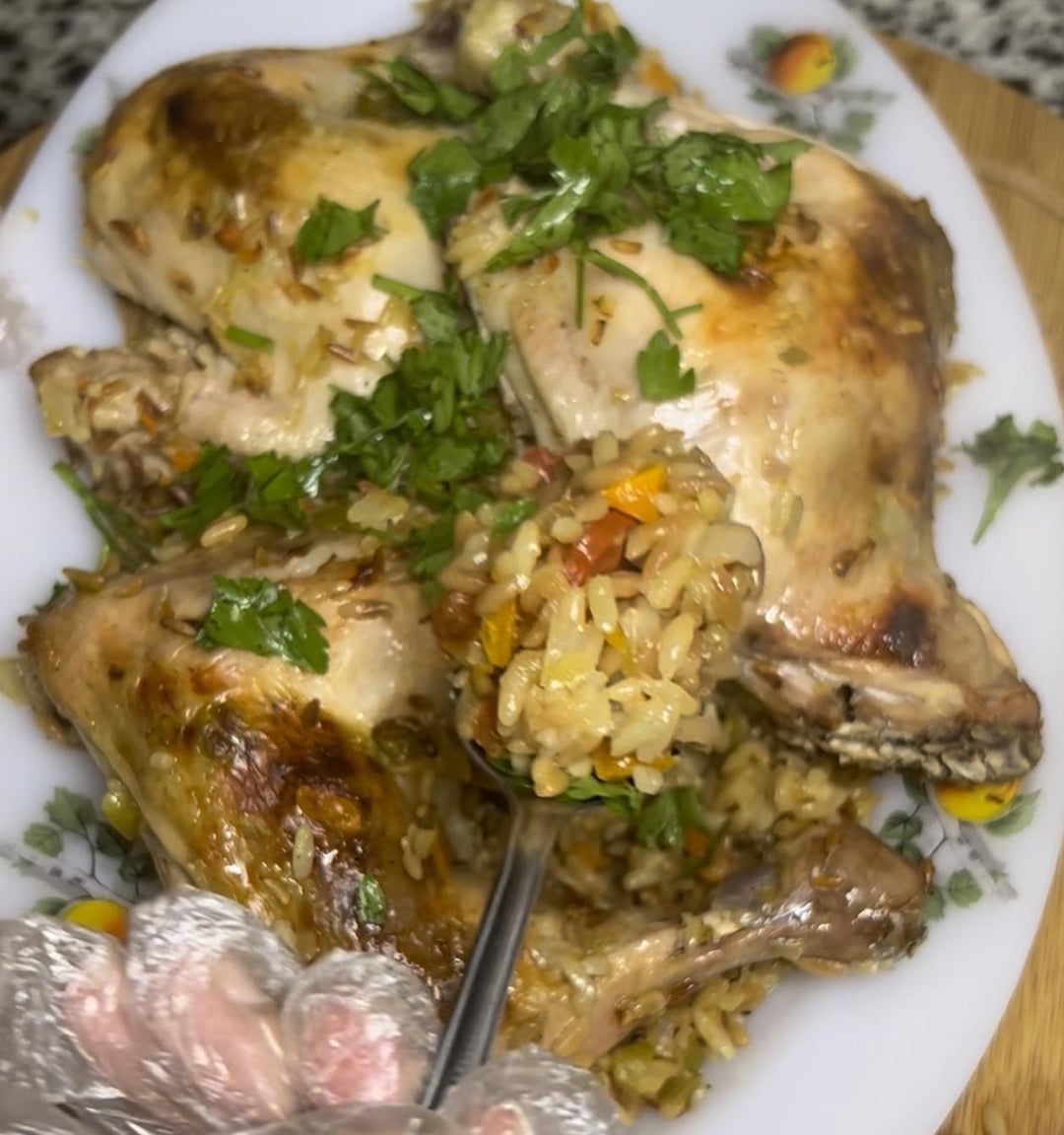 Add chicken and put part of grated vegetables on it and more between skin and meat