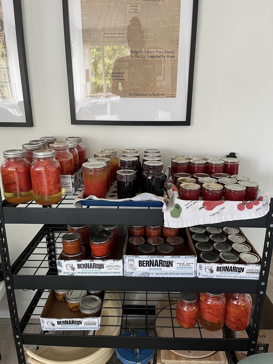 Adding this to my stash from earlier this year: tomato sauce, pizza sauce, apricot jam, service berries in honey syrup and red currant jelly.