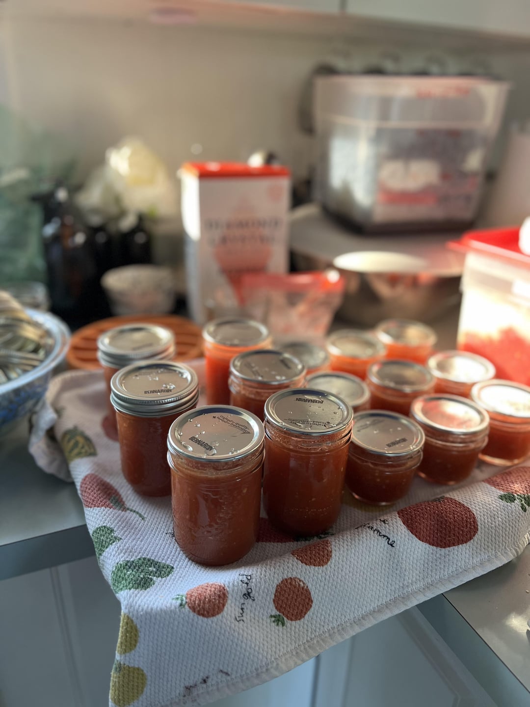 Ready for winter! I had a baby this year, so I’m only doing smaller batches of my favorite recipes. Most recipes from Canning for a New Generation by Liana Krissoff and Marissa McClellan’s books (food in jars).