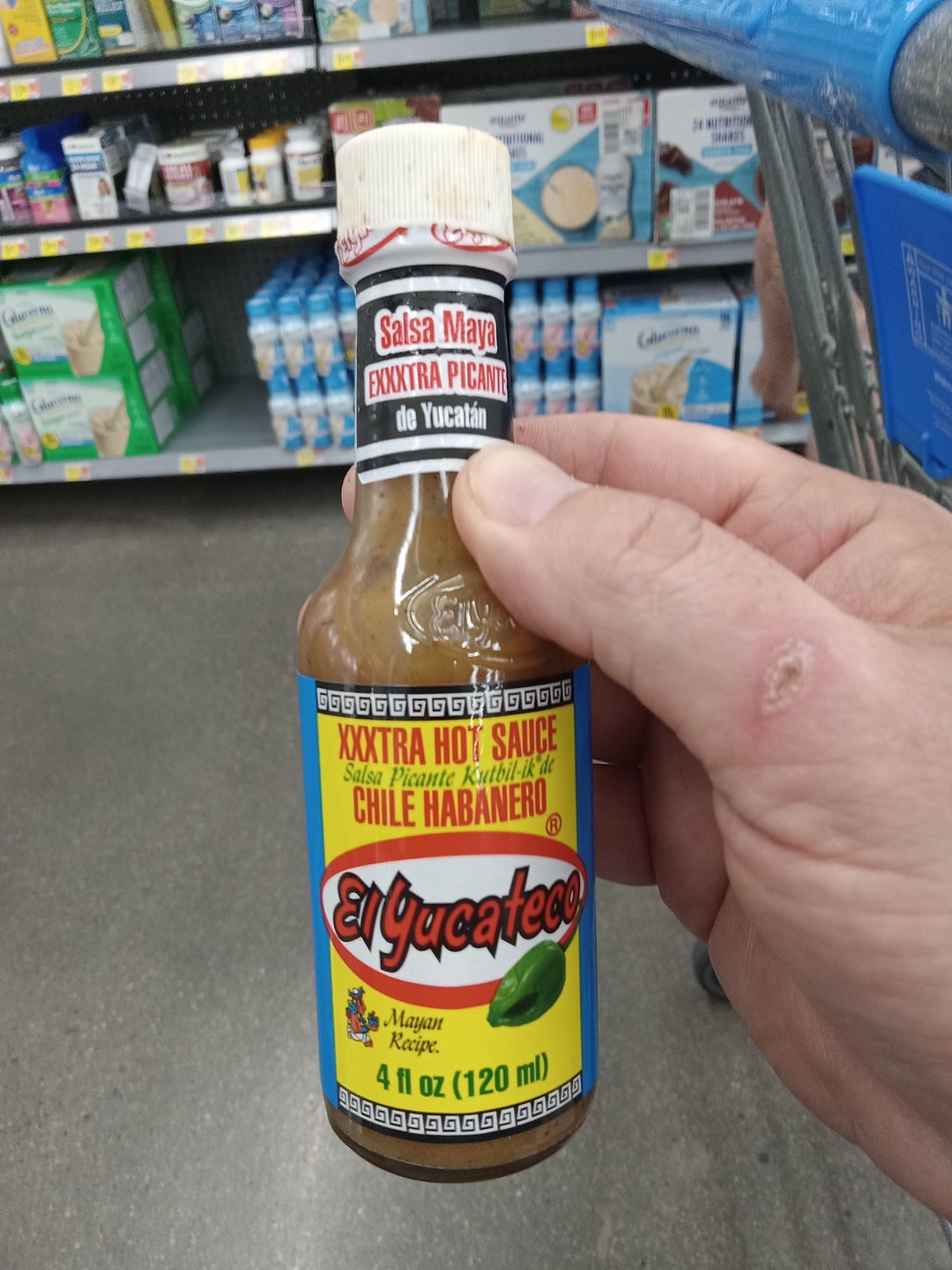 After nothing but hot sauce disappointment at Walmart, I found this beauty on the very top shelf still in a box that hid the label. All you could see was the cap, I don’t think anybody knows it’s up there LOL.