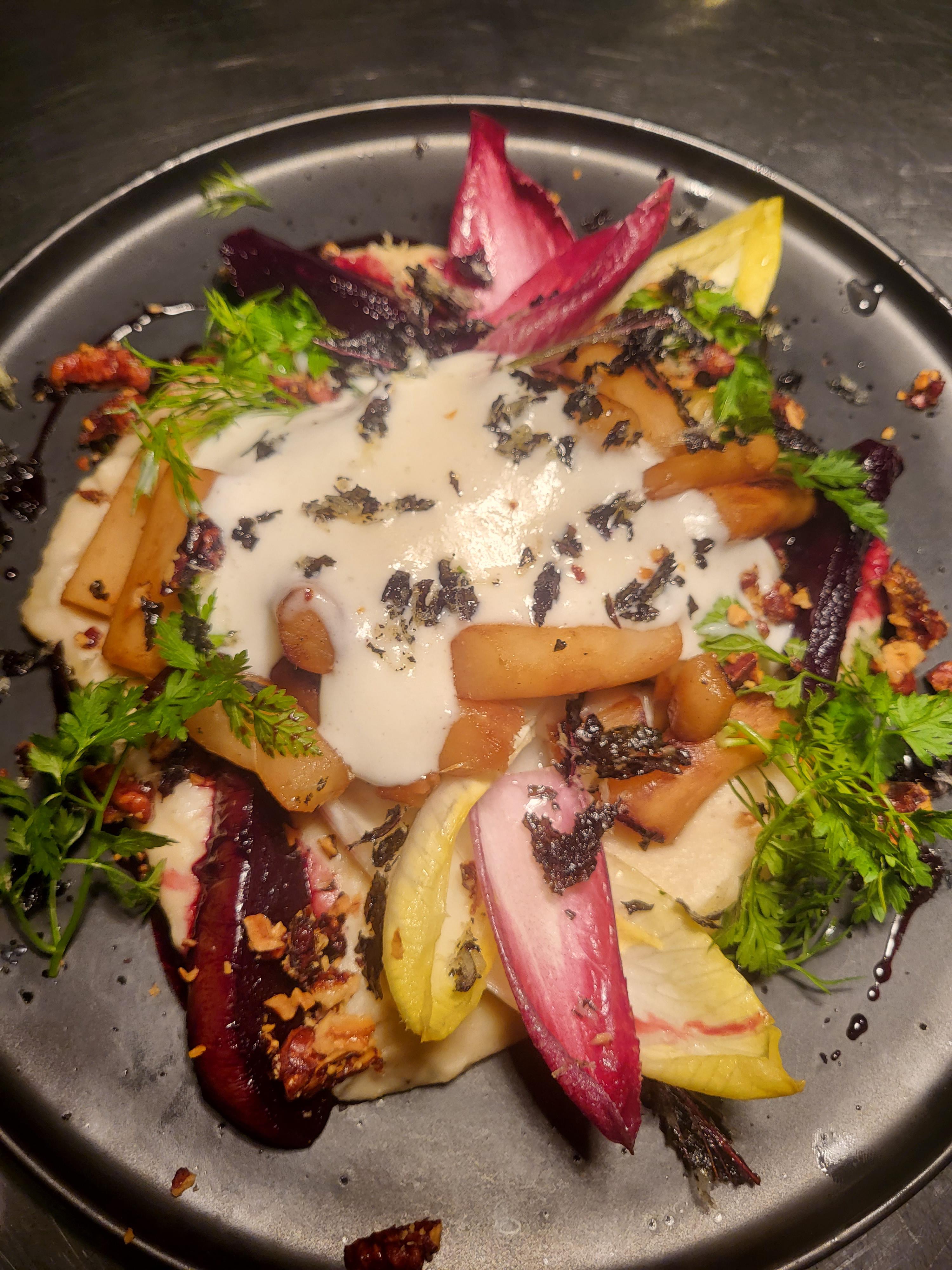 Black Salsify – Pecorino Foam, chicoree, pear, walnuts,shiso
