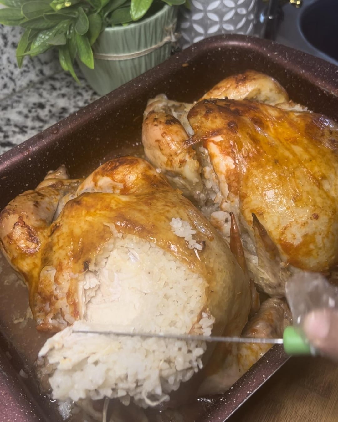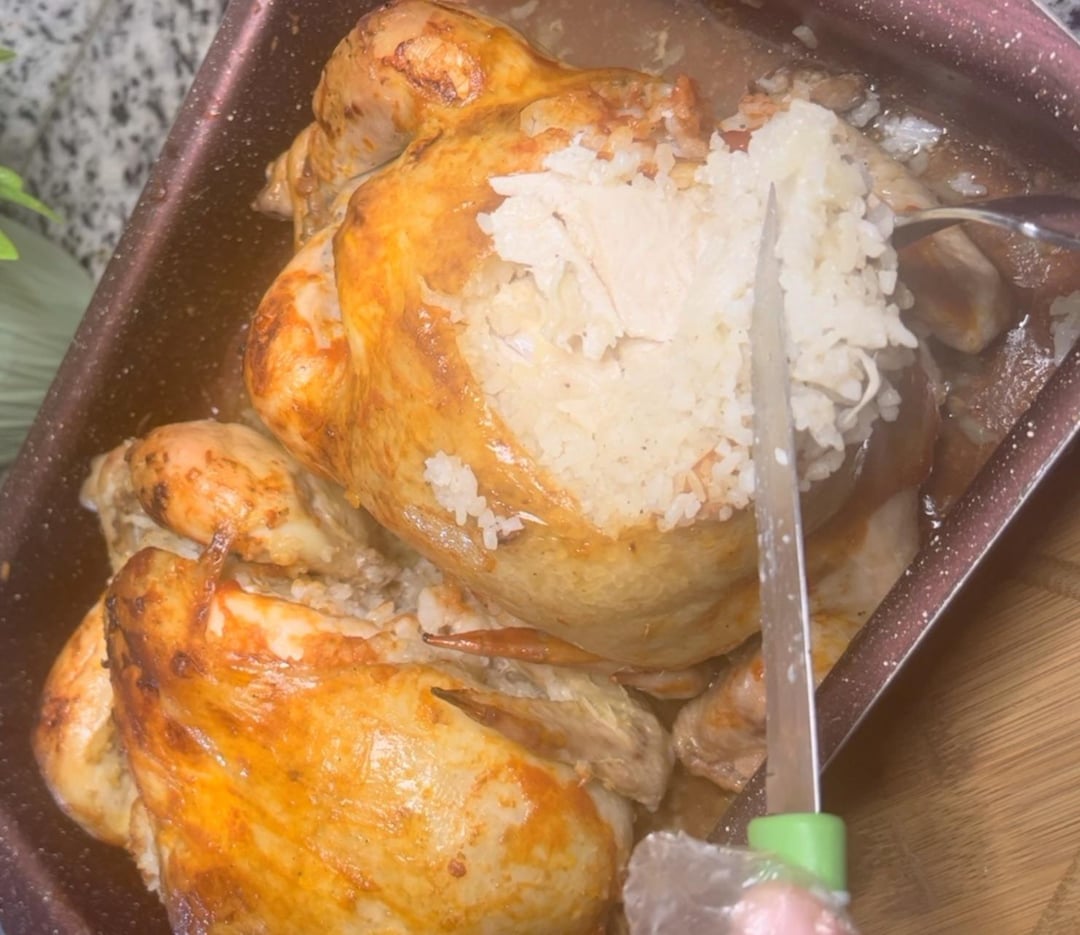 Season chicken well with grated onion from inside and outside and between meat and skin and leave it 5 minutes
