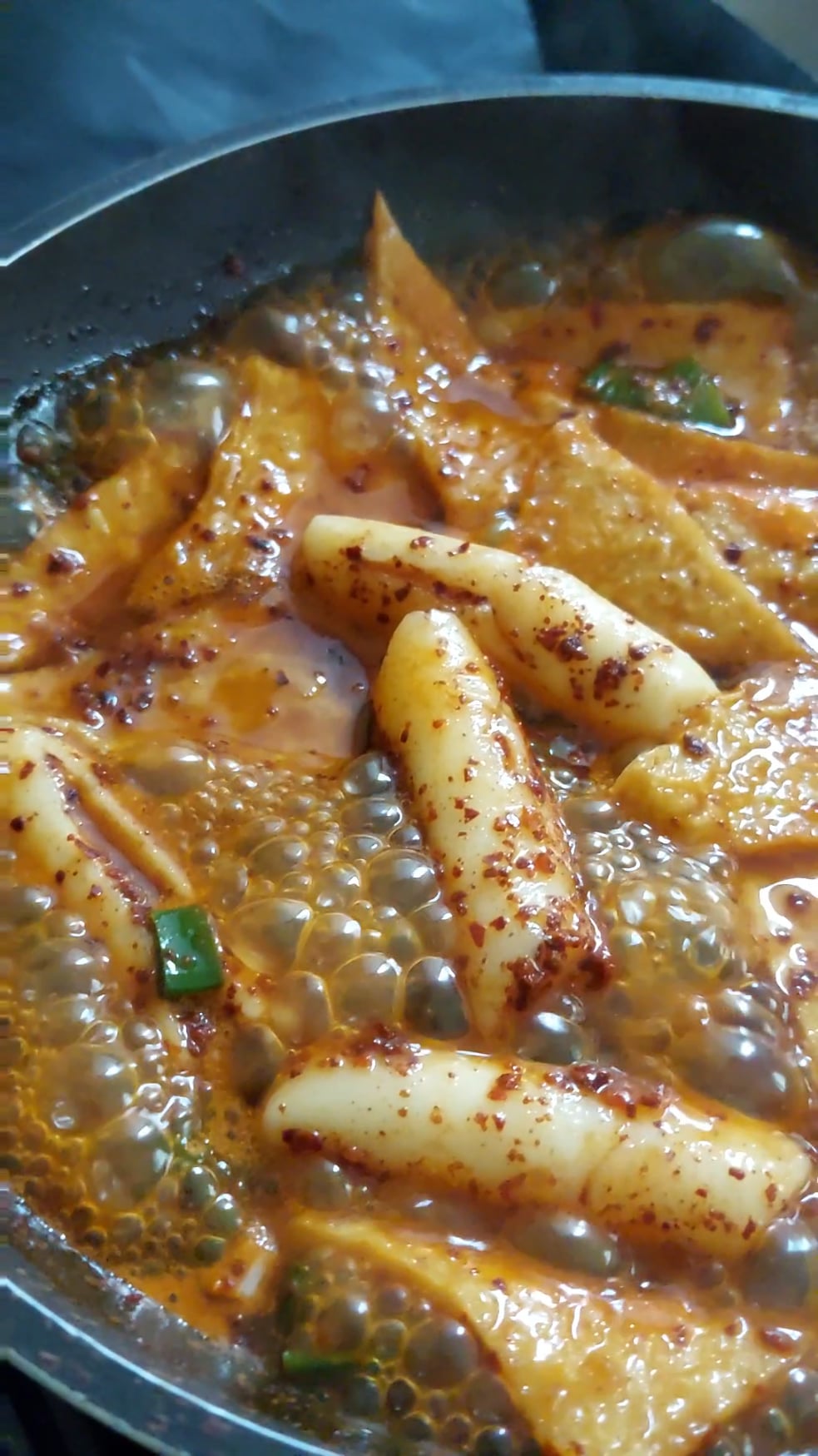 looks great, tteokbokki is usually prepared with gochujang (chilli paste), not gochukaru (chilli flakes), though.
