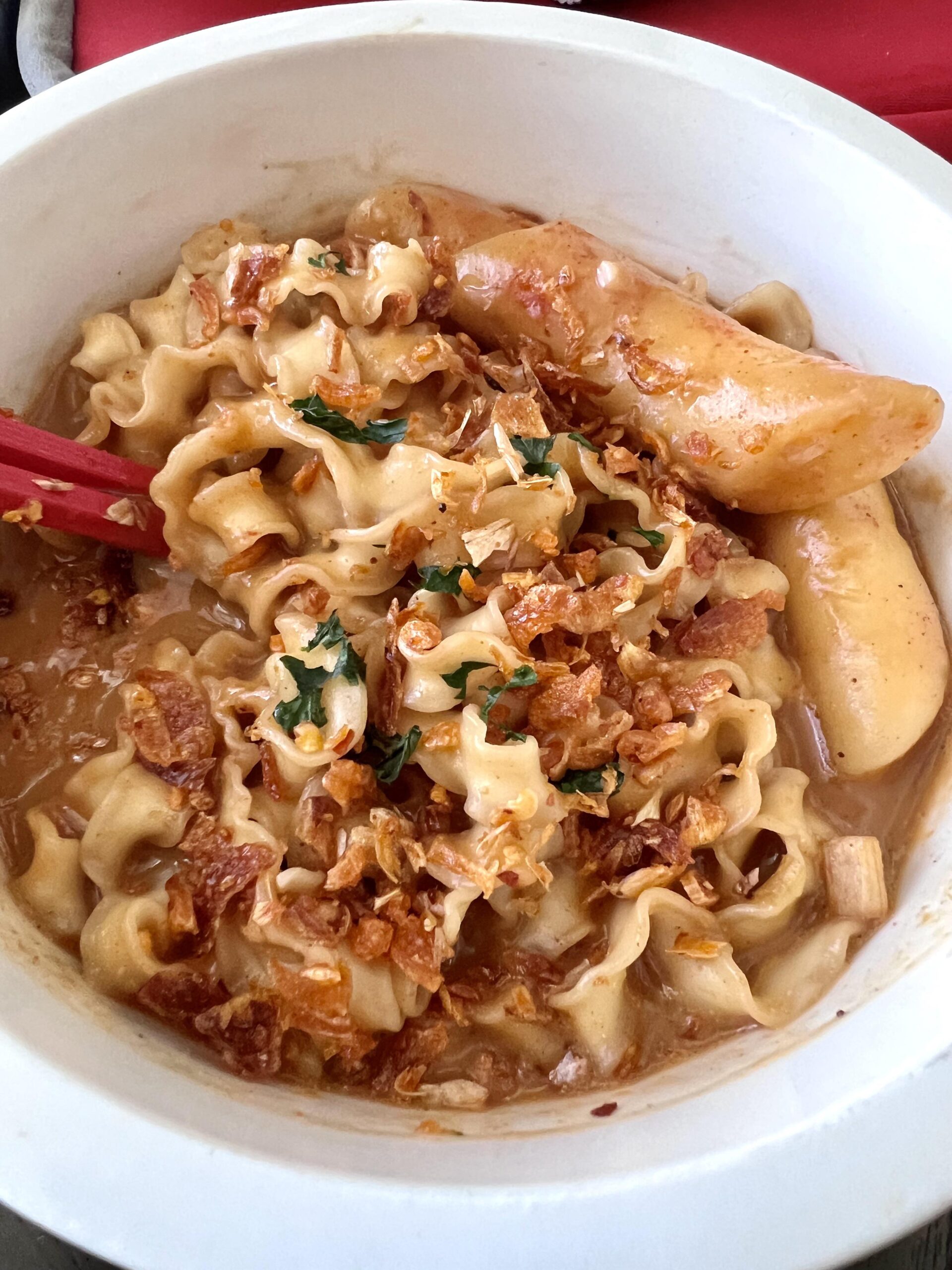Made w/ soy sauce, sesame oil, garlic, ginger, gochujang, rice vinegar and peanut butter and I threw in a little tteokbokki on the side