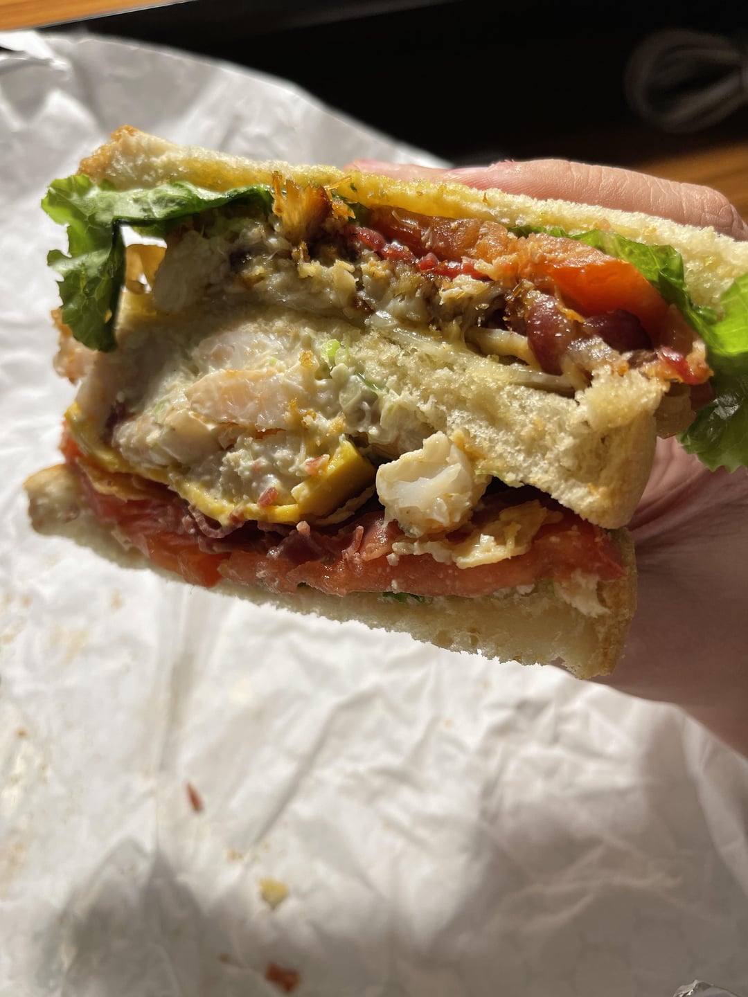sutley6 2 years ago From top to bottom. Crab-cake, lettuce, tomato, bacon, bread, shrimp salad, bacon, lettuce, tomato, and mayo on the bread.