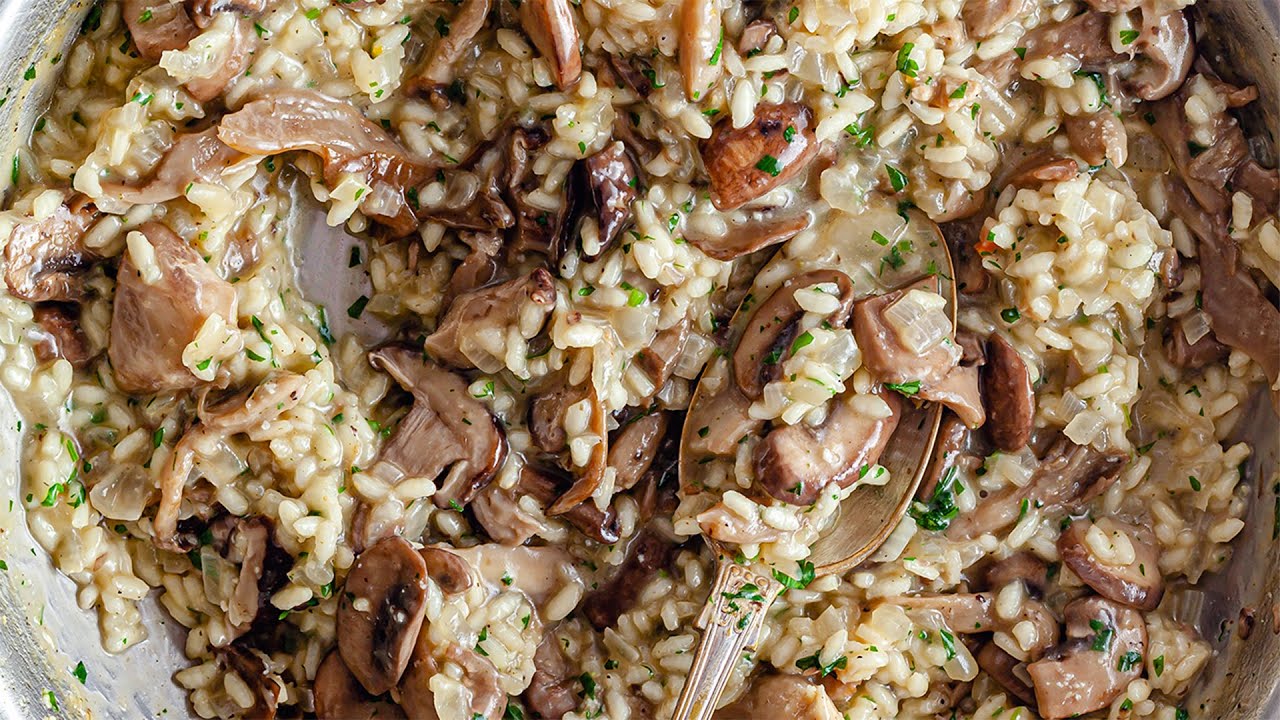Stir in the mushrooms with all their juices and most of the vegan parmesan. Turn the heat off, cover and rest for 5 minutes.