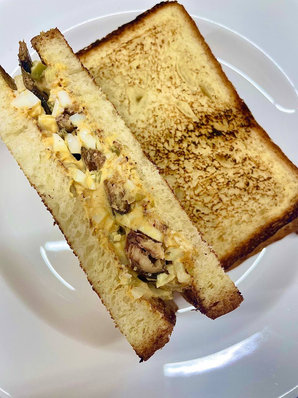 Here the main thing and sprats and egg salad. The composition of the salad is as follows: egg, a little red onion, mayonnaise…it seems all clear, but further we add pickled crispy cucumber, apple, curry and sriracha. Put everything on a piece of toasted bread, top with sprats, cover with a second piece of bread and it will be very tasty!