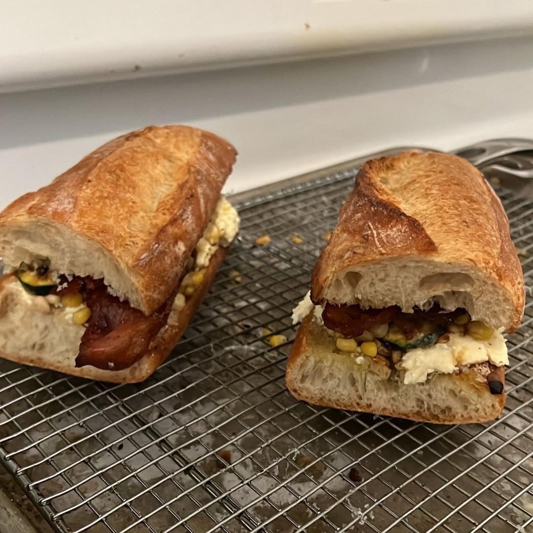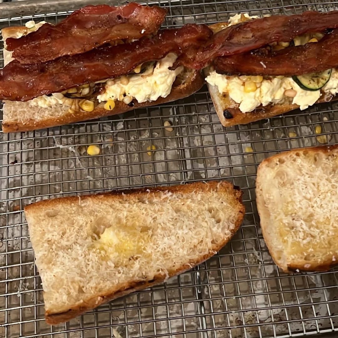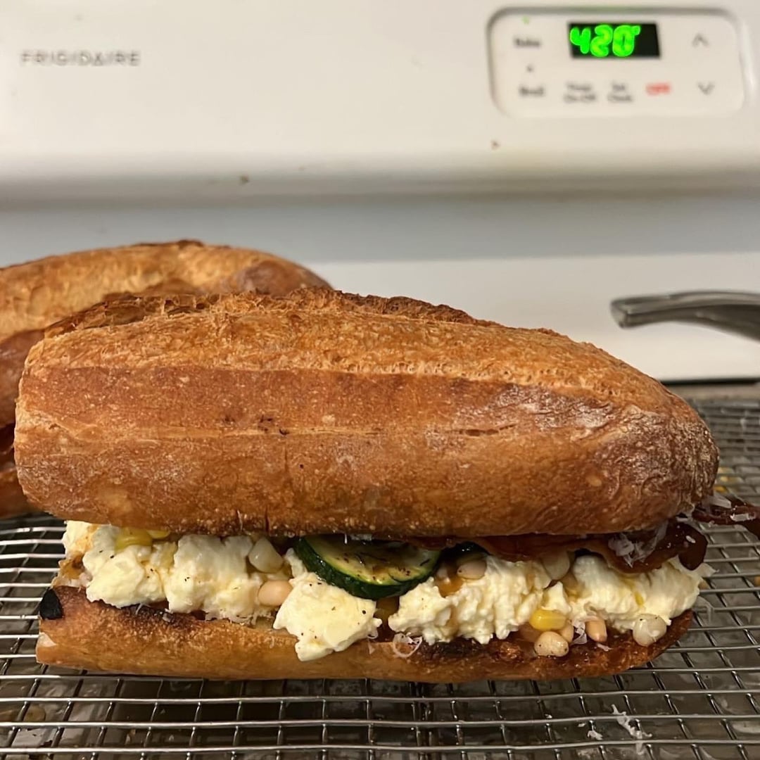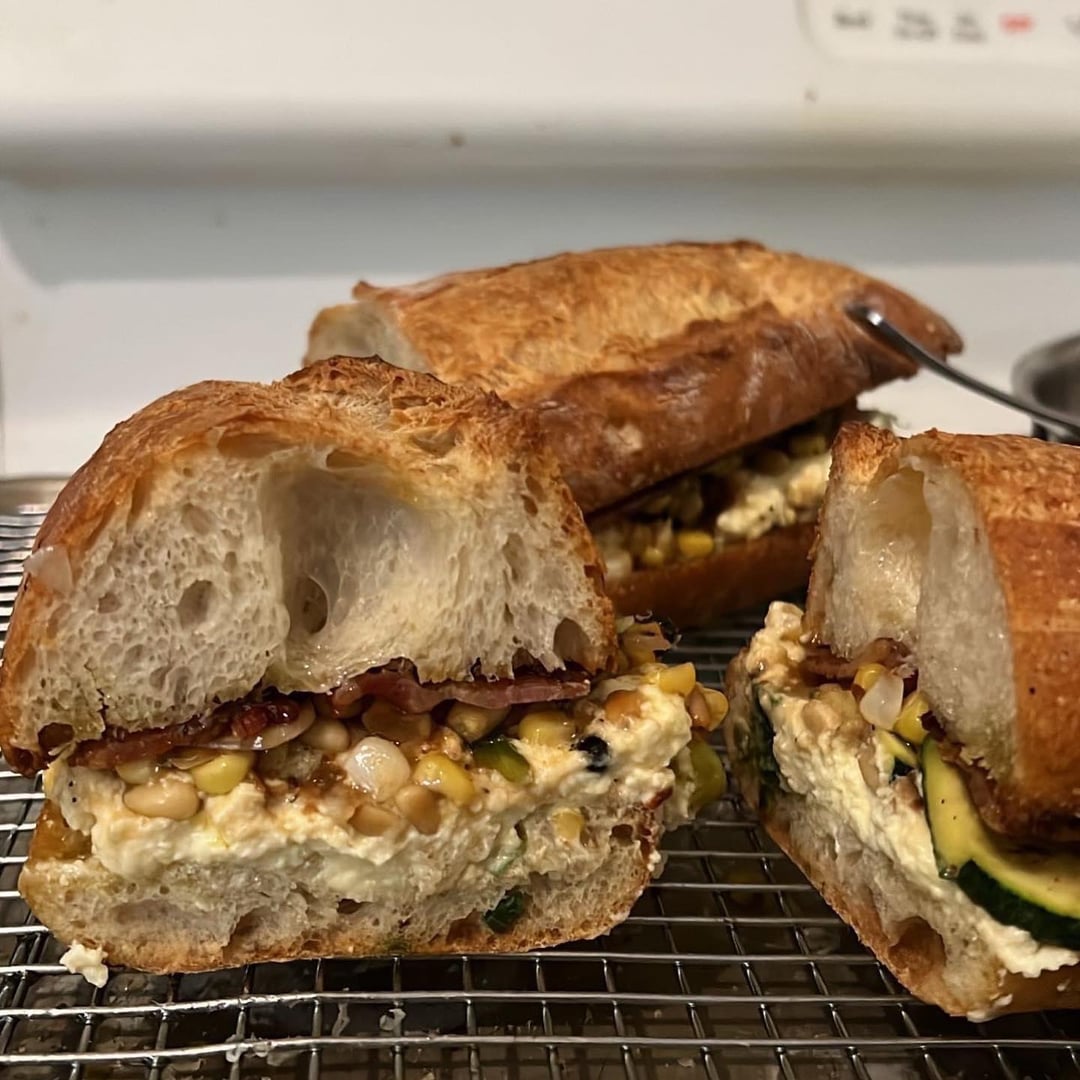 Ancienne baguette sandwich with sautéed zucchini, corn, and garlic, salted bellwether farms basket ricotta, isigny spring butter, parmigiana reggiano, fermented peppercorns, toasted pine nuts, and honey peppered bacon