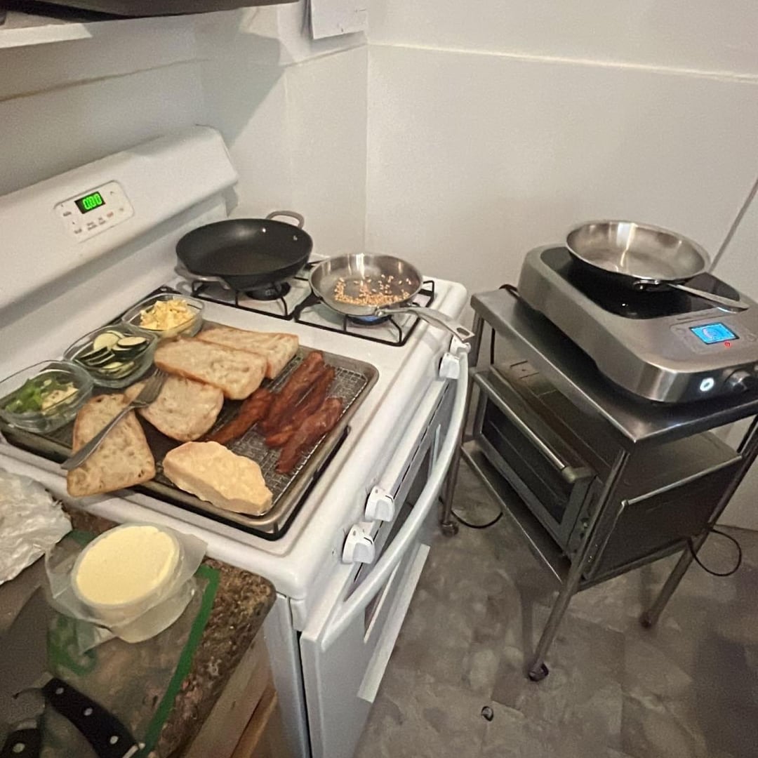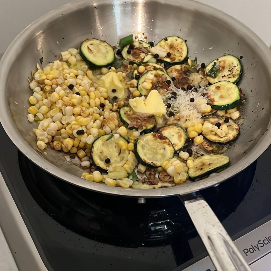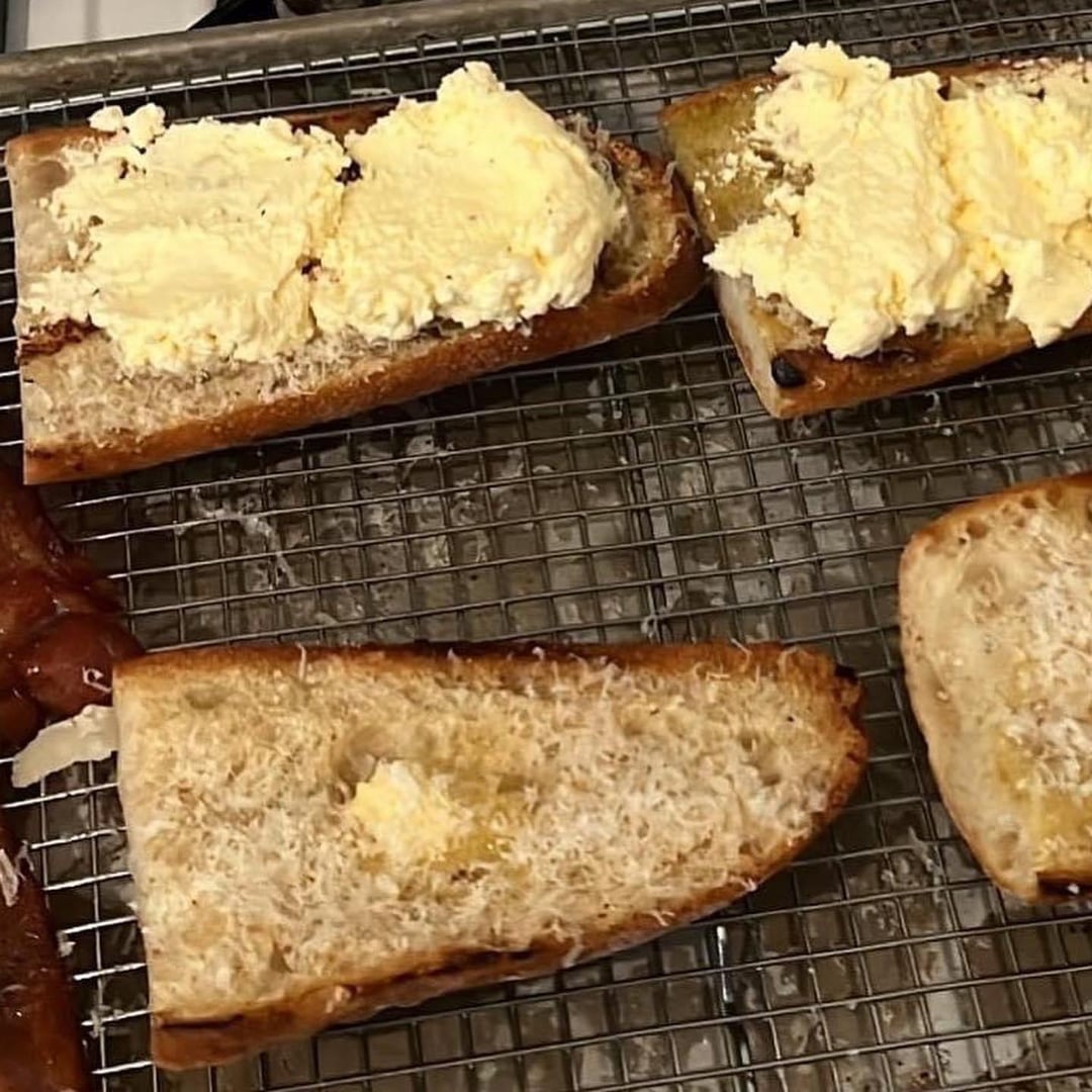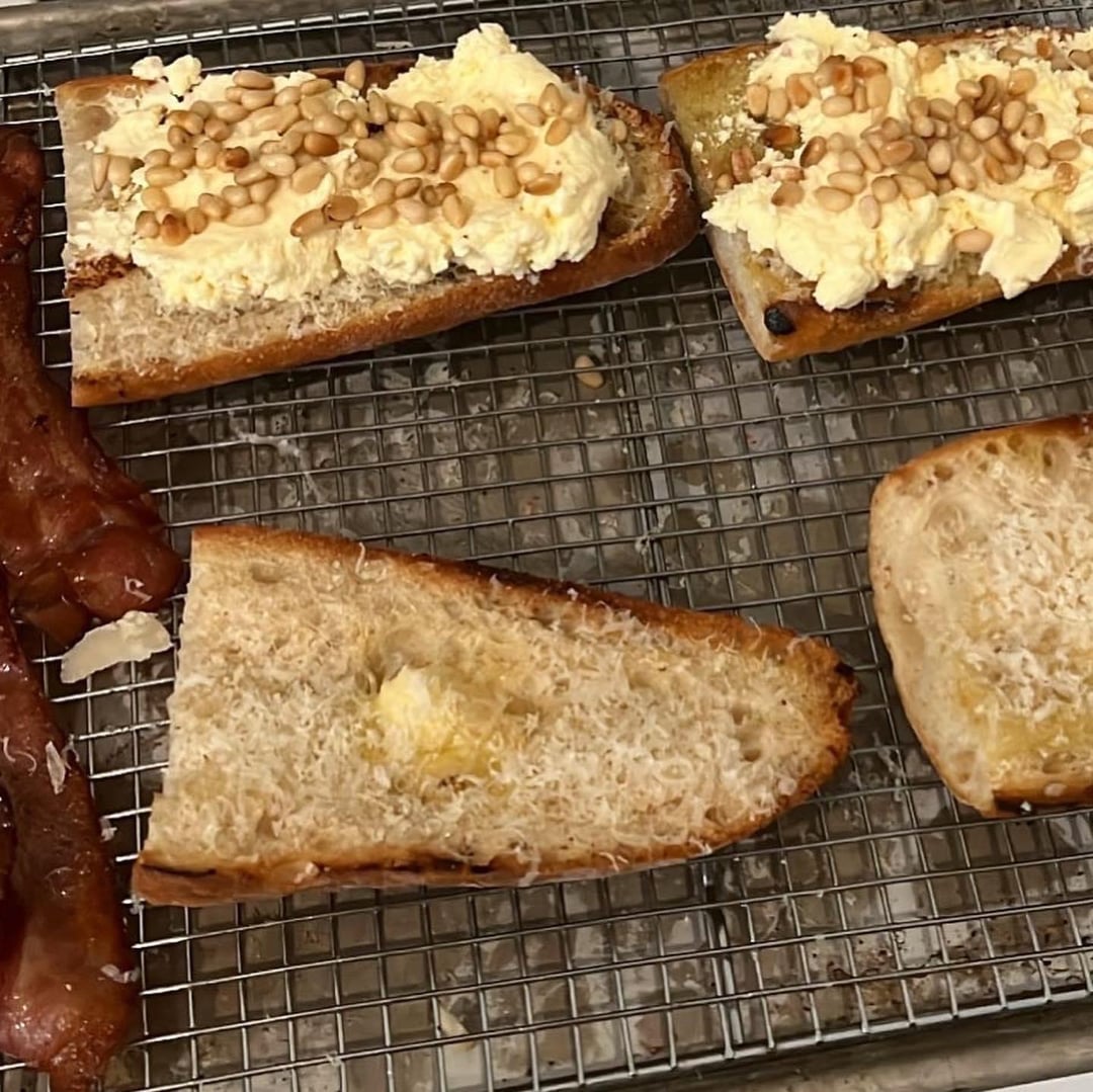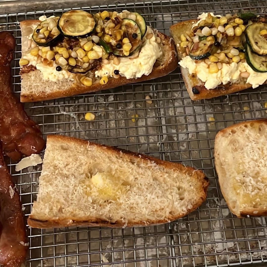 Ancienne baguette sandwich with sautéed zucchini, corn, and garlic, salted bellwether farms basket ricotta, isigny spring butter, parmigiana reggiano, fermented peppercorns, toasted pine nuts, and honey peppered bacon